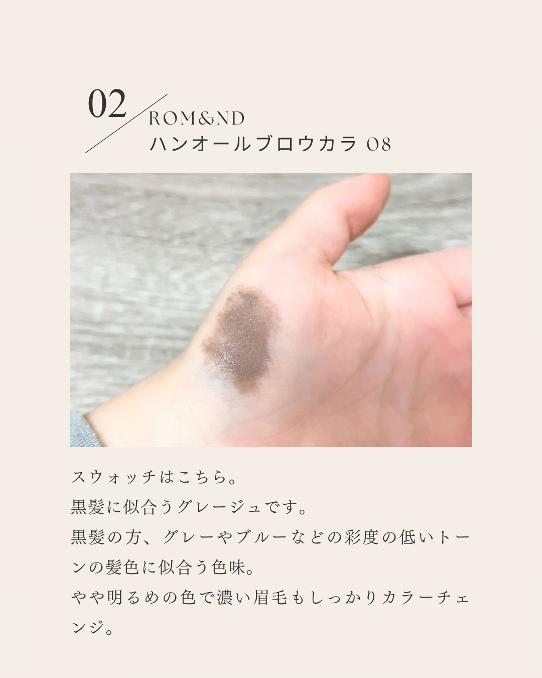 \黒髪さんにおすすめ🩶儚げグレー/rom&ndハンオールブロウカラ08ムーングレー黒髪の時に大活躍している01グレイストープよりも薄くて儚げな印象🩶こなれ感が出る〜〜!!!黄みがほとんどないので髪色暗めのブルベさんや黒髪の方におすすめのカラー...