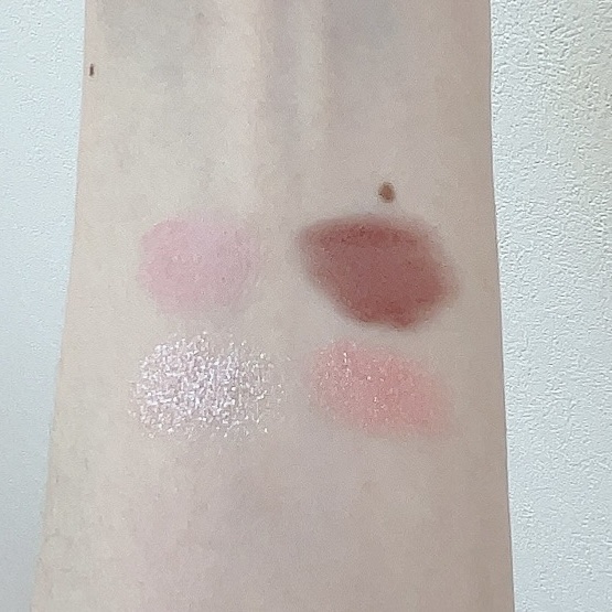 苺ミルクみたいなピンクカラーが入ったピンクブラウンパレット。 色もお値段も可愛いのが魅力的♡ 粉質はやわらか、ややしっとりで下段2色は指塗りかチップ使用がオススメ。
