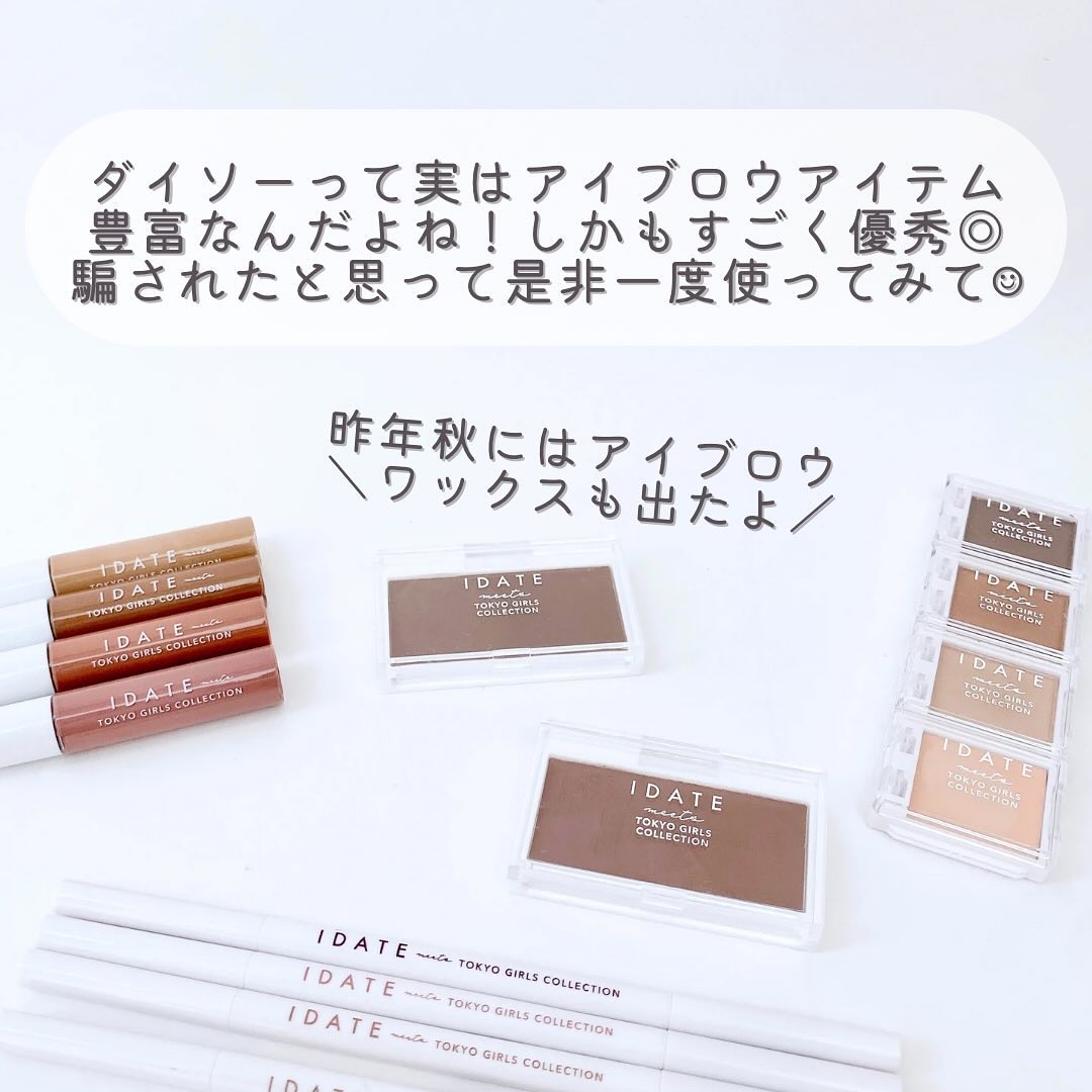 【垢抜け眉作っちゃお🤎】こんばんは🌙ゆかです(◡̈)/♥︎ダイソー×東京ガールズコレクションのコラボコスメ【IDATE(アイデイト)】から春夏の新作コスメが発売されたよ💄アイデイトアイブロウカラーブラシ05アプリコットブラウンJANコード:497401206524006ミルクアッシュJANコード:497401206525707クリアJANコード:4974012065264アイデイトアイブロウペンシル05アプリコットブラウンJANコード:497401206522606ロイヤルベージュJANコード:4974012065233各100円(税込110円眉マスカラの06番めっちゃ好き🤍一気に垢抜け眉が作れるよ!!ベタっとつかないのもいいし擦っても消えないしホント優秀👏🏻これが100円で買えるのは有り難い🥺💕07番のクリアカラーはしっかり眉がある方や自眉を活かしたい方にオススメ🎶パリパリしたりもしないよ◎アイブロウペンシルも細芯で描きやすいしスクリューブラシがついてるのも嬉しい🎶URGLAMのアイブロウペンシルが好きだった人はこれも好きだと思う🫶🏻是非#ダイソーでチェックしてみてね🕊͗͗〰︎︎♡ーーーーーーーーーーーーーーーーーーーーー#ダイソー購入品#ダイソー新商品#100均購入品#100均新商品#ダイソーコスメ#100均コスメ#プチプラコスメ#プチプラコスメレビュー#プチプラコスメ購入品#コスメ購入品#メイク初心者#アイデイト#IDATE#アイブロウ#眉メイク#アイブロウペンシル#アイブロウマスカラ#眉マスカラ#アイブロウカラーブラシ#垢抜け眉#垢抜けメイク#春メイク#春コスメ#春夏コスメ#イエベ春#ブルベ夏#イエベメイク#ブルベメイク