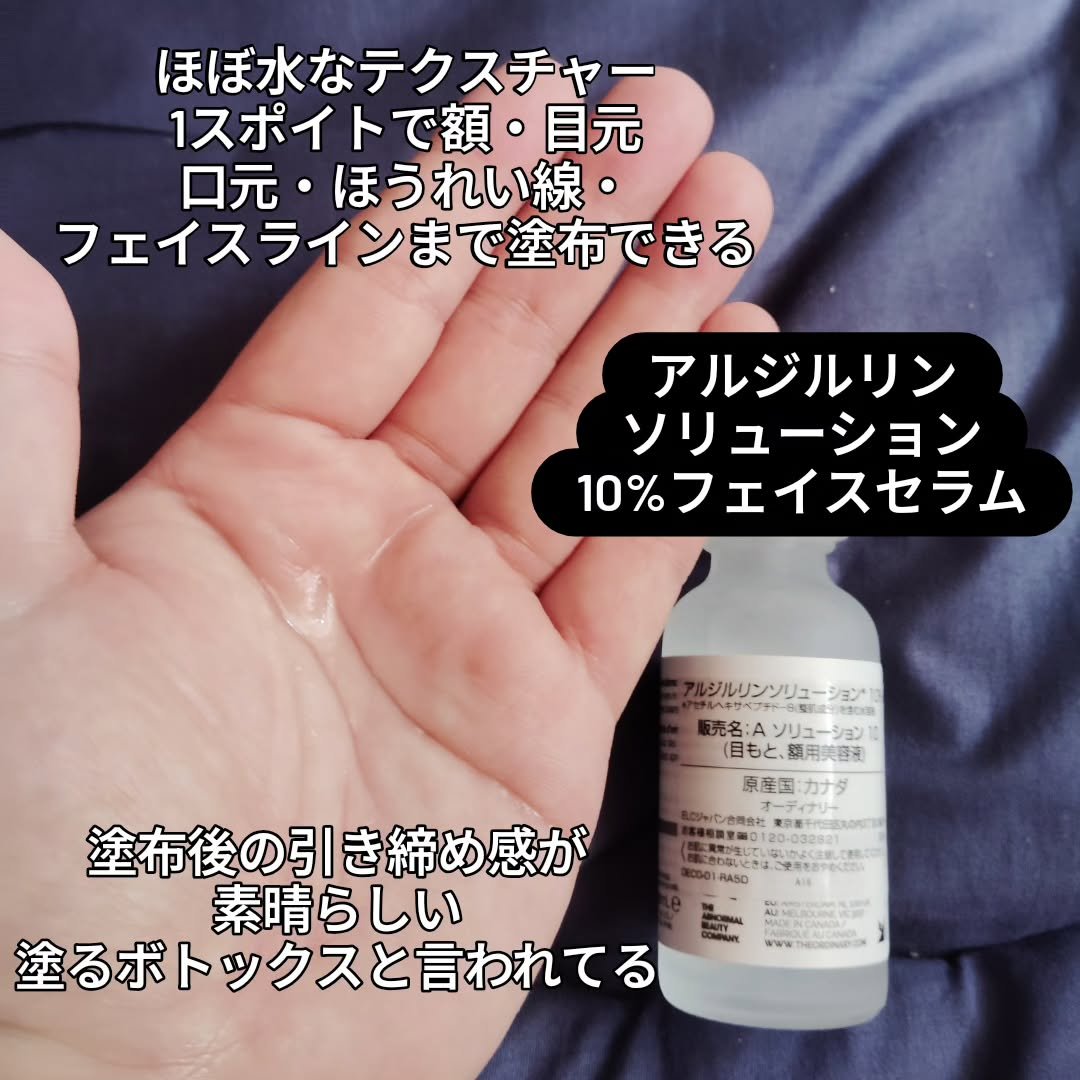 #TheOrdinary#ナイアシンアミド10%+亜鉛1%#アルジルリンソリューション10#毛穴皮脂ケア#シワたるみケア#購入品アットコスメで購入して良かったと個人的に思ったので投稿しますねーTheOrdinary☆N10+Z1フェイスセラム60mlナイアシンアミド10%+亜鉛1%※亜鉛入ってるので金属アレルギーの方は注意これは以前購入したアットコスメ限定スキンサポートセットに入ってたもので投稿してますベタつきやすいのでごく少量からがオススメこの季節になったら使いやすいと思います毛穴・皮脂ケアがメインですが、保湿力もあるので大人世代にピッタリな美容液ナイアシンアミドが入ってるので紫外線ダメージが気になる方にもオススメ30mlは1,100円、60mlは1,980円とコスパが良いのも嬉しい☺☆Aソリューション10フェイスセラム30mlアルジルリンソリューション*10%「塗るボトックス」という二つ名がある美容液目もと・額用美容液とありますが、簡単に言えばシワやたるみが気になるところに塗布するもの水のようなテクスチャーですぐ消えるので必死に額・目元・ほうれい線・フェイスラインに塗布してます出来たばかりの小じわなら消えるし、ほうれい線周りのもたつきやたるみが引き締まる感じフェイスラインもシュッと引き締まる個人的にたるみが気になってる方に刺さる美容液だと思います1回1スポイトが目安で、使用を止めると元通り深いシワやたるみだと効果を実感しにくいようですアラサー・アラフォーで顔に重力感じ始めた方にオススメ30mlで1,760円、他社のシワ・たるみケア商品に比べれば安いし効果が目に見えるので自分はリピートする✨️あと今年はコフレも販売するので、試すのに丁度良さそうだと思います#夏バテ肌レスキュー