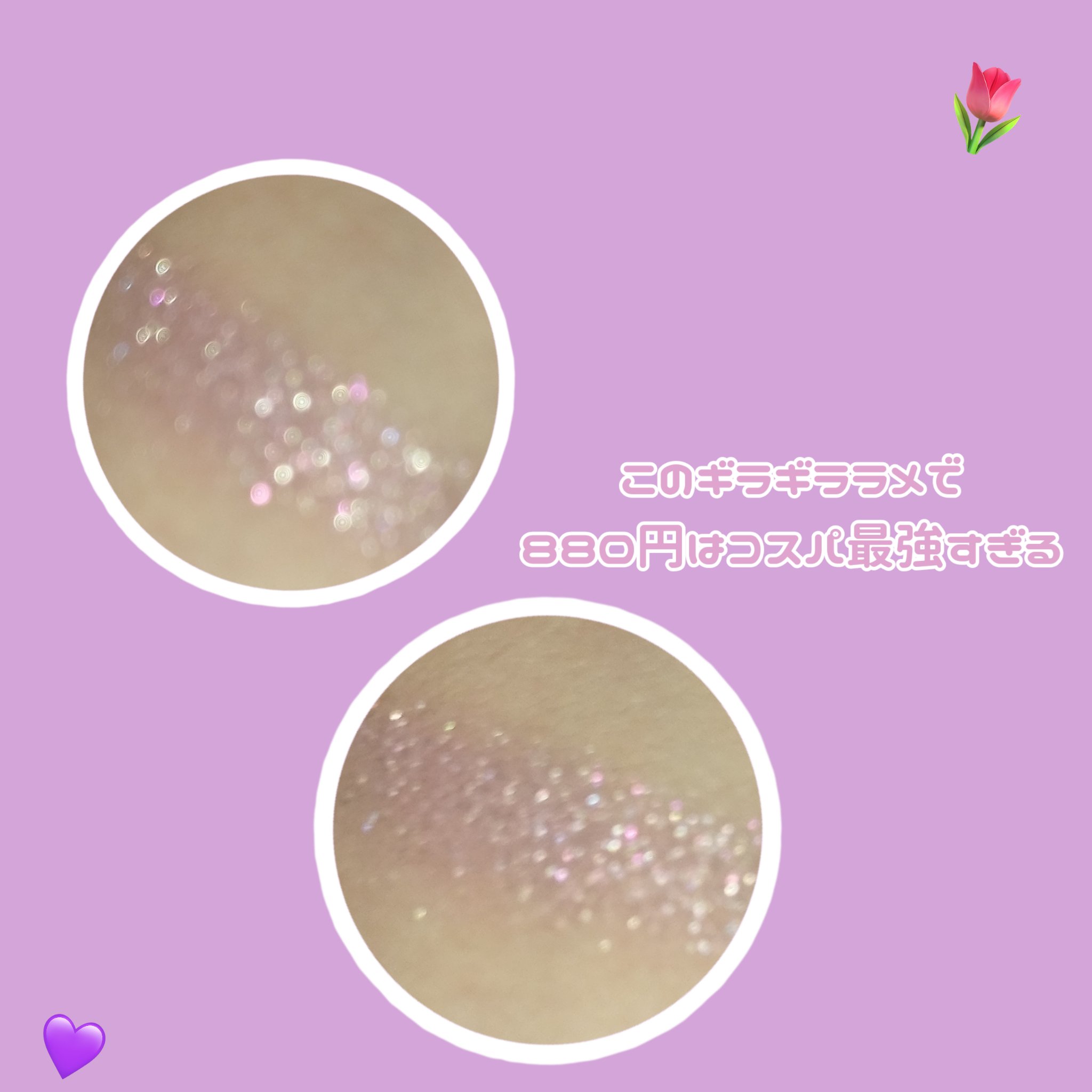 これはもう…ラメオタク大歓喜の輝きです 先にお伝えしますがコチラなんと¥880💁🏻♀️💥 この価格の輝きではない🤦🏻♀️💜 名前が『うるみオンアイズ』というだけあって、うるっとキラッと華やかな目元になります 涙袋・上瞼だけじゃなく、目頭に乗せるとまっっじでおきゃわなのほんともう語彙力失うくらい可愛いです。