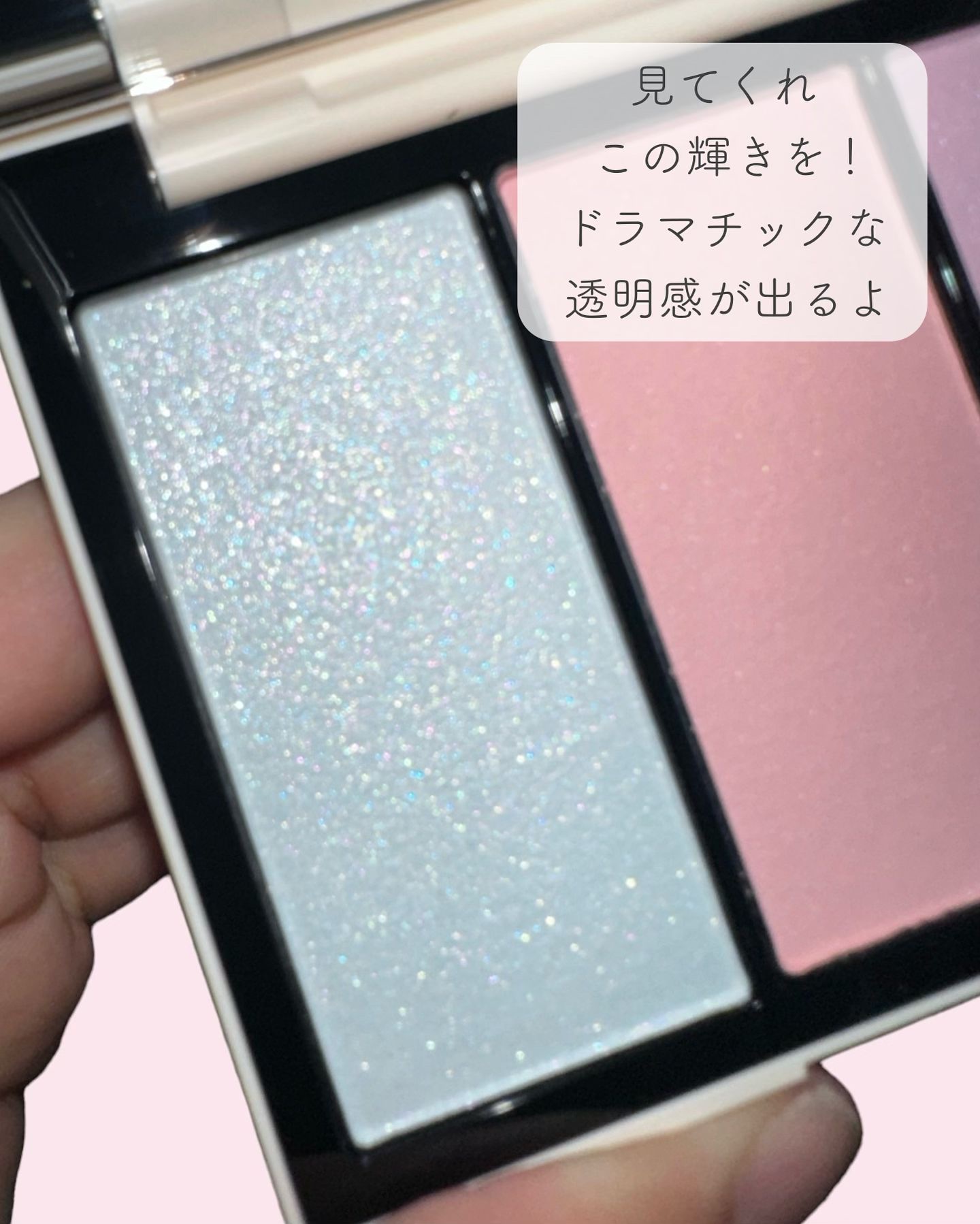 もーーーーーめちゃくちゃかわいいこれ🥹 一目惚れで購入...♡ 左は輝度の高いガラスパールが キラッキラ輝いて透明感が 爆発するアイスブルー いちばんのお気に入りカラー! 右は2種類のブルーパールが ペカァッと輝くクールなラベンダーカラー このカラーも可愛いんだけど、 頬にハイライトとして使うには色味が出るから ニュアンサーとして使うのがいいかも。