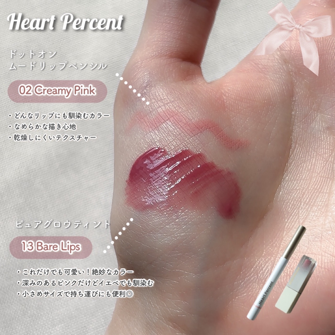 HeartPercent【GirlCore】▶ドットオンムードリップペンシル02.クリーミーピンク▶ドットオンムードピュアグロウティント13.ベアリップスペンシルがスルスルッと描きやすくて、ぼかしても消えにくくて優秀🩷🩷チークやアイシャドウと...