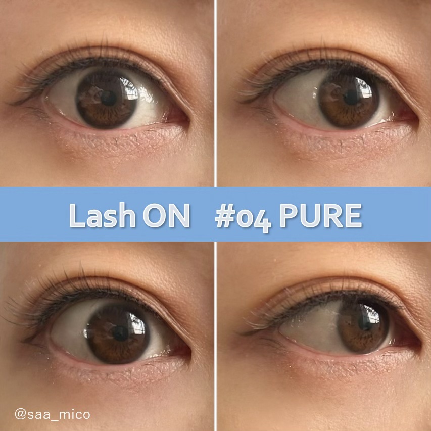 0.05㎜~0.07㎜の超極細毛が使用されているので目元から浮かずに仕上がりがとってもナチュラルなんです。 つけているのを忘れるくらい軽くてつけ心地がいいです。 04 繊細ボリューム PUREを使用してみました♪ 自然に密度をプラスしたやりすぎないピュアな目元にしてくれるタイプです。 中央〜目尻にかけて長めになっているので大人っぽさもプラスされます。