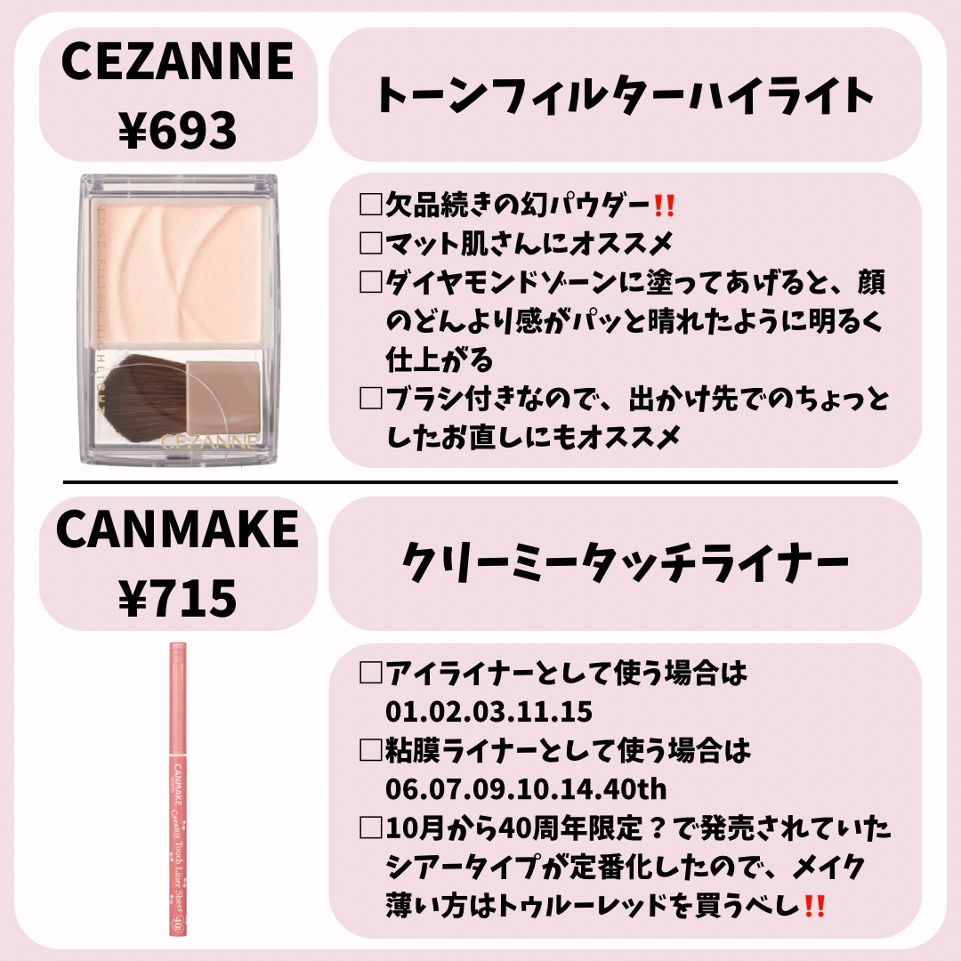 ¥990以下で買えるのすごすぎる👍✼••┈┈••✼••┈┈••✼••┈┈••✼••┈┈••✼こんにちは。男子高校生きまっちゃんです🐰今回は、¥990以下で買える、感謝感動プチプラコスメを紹介します‼️お値段が高いコスメから、購入しやすい価格のものまで色々使いまくった中で、今回紹介するコスメは『唯一無二‼️orこの価格でいいんですか⁉️』と思った感謝すると共に感動コスメです(個人の意見です☺️)ほとんどのコスメがドラックストアで購入できるので、ぜひチェックしてみてください♪────────────参考になった方や、気になる商品があった方は、は、いいね👍やコメントで教えてくださると嬉しいです☺️投稿を保存📎しておくとお買い物の際に見返せて便利です♪────────────✼••┈┈••✼••┈┈••✼••┈┈••✼••┈┈••✼CEZANNE¥550チークブラッシュ□01はくずみローズピンク□02はブラウンベージュ□03は青み強めの薄ピンク□04はパソカ気にせず使える血色ピンク□価格が挑戦しやすいので初めてのチークにオススメ‼️□ブラシも濃くつきすぎないので使いやすい────────────ちふれ¥550リップスティックY□推しは657ベージュと、751ブラウン□秋冬の時期は落ち着いセミたマットリップを使いたいと思っていた時に見つけた□マット系リップ特有の乾燥感やパサパサ感を感じにくい□食事・飲食しなければ落ちないし、塗り直しもしやすい────────────minum¥550アイブロウペンシル□推しは02ナチュラルブラウン□細い平型のアイブロウペンシル□薄づきで自然な涙袋の影が描ける□目頭から目尻に向かって一本で描いてから、追加で黒目下に描き足す□涙袋皆無民こそ使ってみてほしい□minumは安くて良いもの多すぎ‼️────────────CEZANNE¥660描くふたえアイライナー□01は健康的な肌トーンの人向け□02は明るい肌トーンの人向け□03は元から涙袋ある人や、濃いピンクメイクの人向け□スクールメイクや、メイクする時間がない時にさっと線を引くだけで自然な涙袋の影にみえる────────────CEZANNE¥693トーンフィルターハイライト□欠品続きの幻パウダー‼️□マット肌さんにオススメ□ダイヤモンドゾーンに塗ってあげると、顔のどんより感がパッと晴れたように明るく仕上がる□ブラシ付きなので、出かけ先でのちょっとしたお直しにもオススメ────────────CANMAKE¥715クリーミータッチライナー□アイライナーとして使う場合は01.02.03.11.15□粘膜ライナーとして使う場合は06.07.09.10.14.40th□10月から40周年限定?で発売されていたシアータイプが定番化したので、メイク薄い方はトゥルーレッドを買うべし‼️────────────CEZANNE¥781ブレンドカラーシェーディング□今のところの推しは01だけど、色味がピッタリ合ってるとは言い切れないので、12月発売の03メリハリトーンのテスターをみて買うのがいいかも‼️□発色は、全体的にナチュラル。鼻のシェーディングは何度も重ね塗りして形を整えていくので、薄めの発色がいい。────────────rom&nd¥825ハンオールブロウカラミニ□推しは03(通常サイズも含めると11)□眉を薄く見せたいけど、消したくはないと言った思いがある人にオススメ‼️□髪トーンより明るい色を使うと簡単に垢抜け感がでるのでオススメ‼️□黒く太い長めの眉毛でもしっかりと色がつく────────────CANMAKE¥858パーフェクトマルチアイズ□推しは05.08.09で、パソカ関係なくオススメ□右上を全体に塗って、高さを出したい部分に左上を塗って、締めたい部分に下段2色を混ぜて塗る□小さくてコンパクトかつ、チップブラシ付きなので、外でメイクする時にもオススメ────────────muice¥968うるみハイライター□肌馴染み重視の方は03がオススメ□アイドルのような艶玉好きは02がオススメ□プチプラ〜デパコスまでたくさん試してきた中で1番綺麗に自然に発光する□光らせたい部分にブラシで磨くようにぬる□鼻&目頭は細いブラシでポンポン置くイメージでぬると鼻が高くみえる✼••┈┈••✼••┈┈••✼••┈┈••✼••┈┈••✼#ご褒美コスメ会議#プチプラ#ドラコス