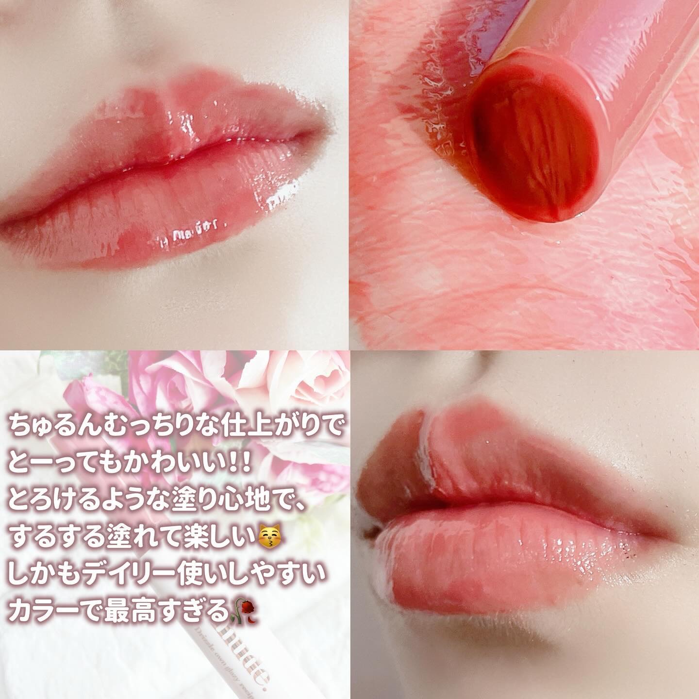 とろけるようなテクスチャでスルスル塗れる◎ 仕上がりはちゅるんむちって感じᐡ ̳ᴗ ̫ ᴗ ̳ᐡ♡ 可愛すぎませんか🥹 色もめっちゃいい感じじゃない? ローズベイって色なんだけどめっちゃ唇に馴染むようなかカラーだし、普段使いしやすそうㅠㅠ