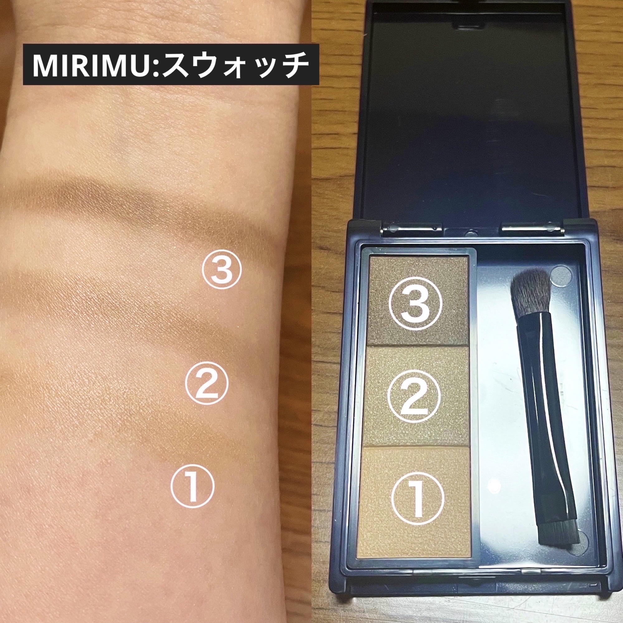 ✼••┈┈••✼••┈┈••✼••┈┈••✼••┈┈••✼ALL¥990で購入出来る新ブランド「MIRIMU(以下、ミリム)」のアイテムをレビューしていきたいと思います。こちらは、「パーソナルカラーアイテムで今よりもっと魅力を引き出して」をコンセプトにされていて、パーソナルカラー別にオススメのアイテムが販売店店頭で紹介されていました。今回、私が購入したのはアイブロウパウダーNBナチュラルブラウン成分:タルク、トリエチルヘキサノイン、リンゴ酸ジイソステアリル、テトラ(ヒドロキシステアリン酸/イソステアリン酸)ジペンタエリスリチル、ポリグリセリル-3ポリジメチルシロキシエチルジメチコン、グリチルレチン酸ステリアル、シルク、トコフェロール、ヒアルロン酸Na、水添レシチン、フィトステロールズ、セラミドNG、セラミドAP、セラミドNP、セラミドEOP、メチルパラペン、マイカ、酸化鉄、酸化チタン、水酸化AI全体的に黄みよりのブラウン、と言ったところです。②と③は写真では分かりにくいですが、細かなラメが入っています。セザンヌのナチュラルブラウンと比べると、分かりやすいですね。(セザンヌのナチュラルは赤み寄り。キャメルの方が色味は近いかな?)粉質は、しっとりしてます。専用ブラシは、ダブルエンド式なのですが斜めブラシが少し短く太めになっていますこのブラシで眉尻の細い線を描くには、練習が必要そうです。(個人的には、ケースに入れるなら無印良品のアイブロウブラシがオススメです)なんといっても、「石鹸で落とせる」っていうのが1番の注目ポイントです!お休みの日に化粧下地+フェイスパウダー+コレを使ってみました。で、お風呂で顔を濡らしただけでは落ちていませんでした。「え、本当に石鹸で落ちるの?」という疑問がわきでましたが、洗顔料でしっかり落ちました。すごい。ニュートラルな色ですし、ONの日もOFFの日も使いやすいアイテムではないでしょうか⁉︎全国のサンドラッグ(一部店舗のみ)で販売されていますので、気になった人は公式HPのショップリストからお近くの販売店を確認してみてください。最後まで読んでいただき、ありがとうございます♪