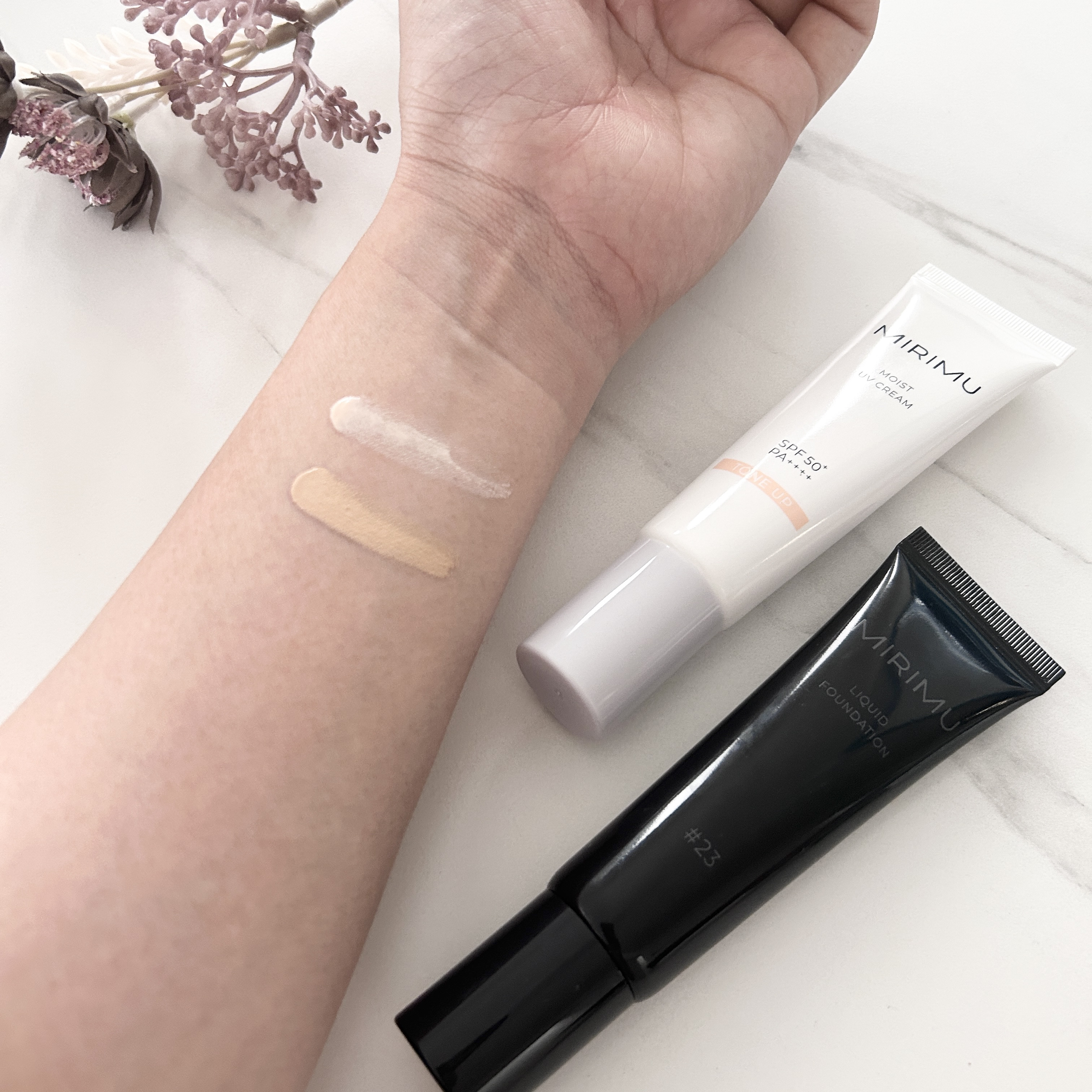 MIRIMUは以前パウダーを使ってみたんだけど 990円コスメとは思えないくらい優秀だったので大好きなブランドです✨✨ 下地は伸びが良く 白浮きしない程度にトーンアップもしてくれて、若干ツヤ感もプラスしてくれる印象✨ リキッドファンデーションも伸びが良く つけ心地が軽いのが好き☺️