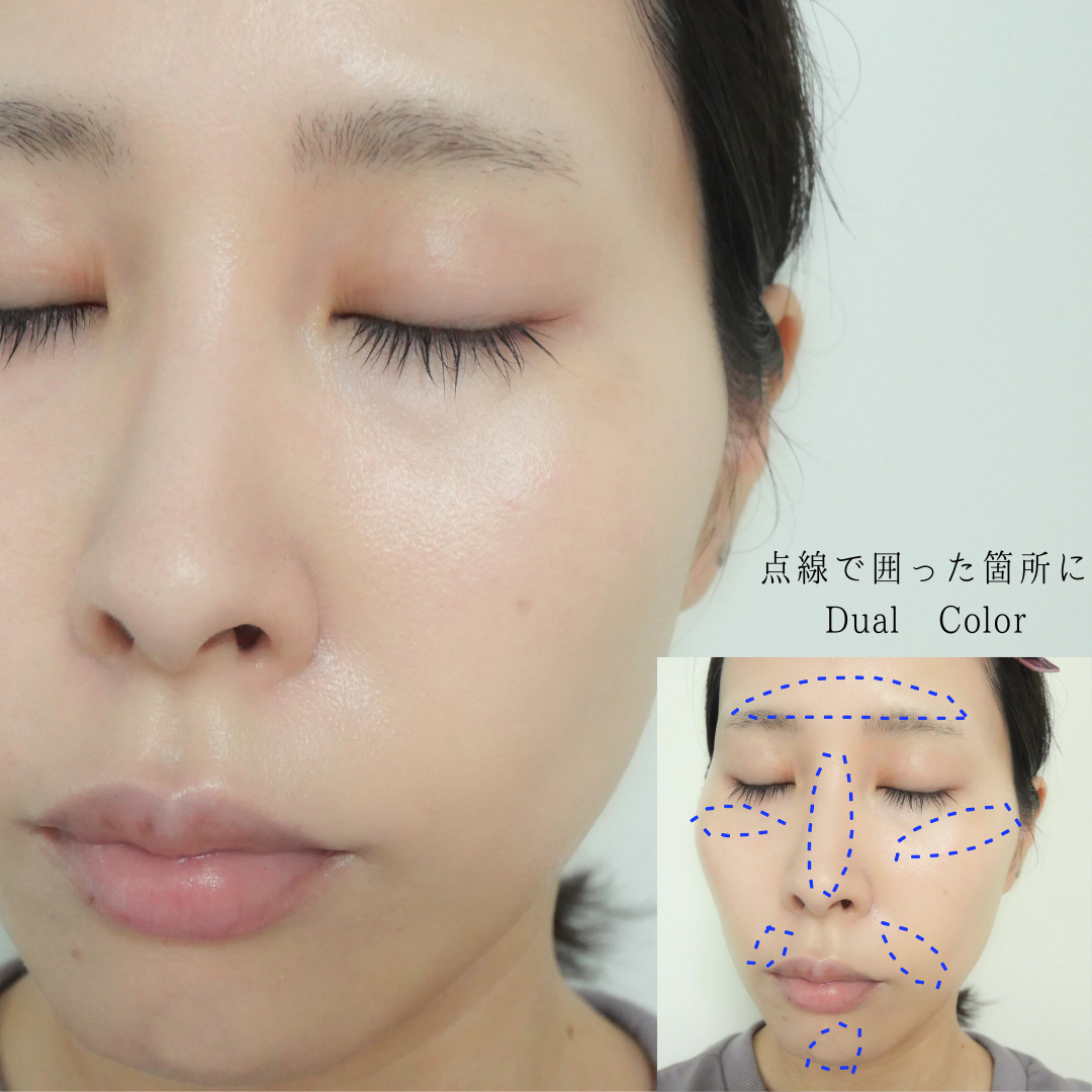 デュアルカラーをおでこや鼻、顎などのハイライト部分に使うことで瞬間立体小顔(*メイクアップ効果による)になれるんです🥹💓 しっとりと肌に吸い付くようなパフで薄く塗るように使うと、セミマットでムラや毛穴のないつるん肌に。 厚塗り感がなくてつけ心地がよく、8種のヒアルロン酸で乾燥することなくしっとりみずみずしく使えるのもすごく良かったです◎