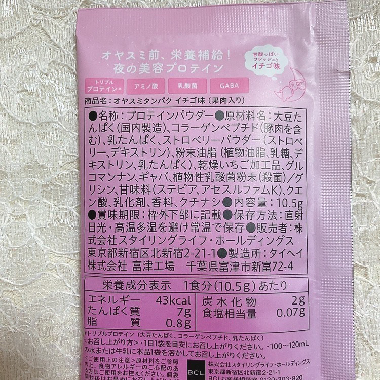 ♡オヤスミタンパク♡イチゴ味(果肉入り)1食分10.5g夜の美容プロテイン✨3種のプロテイン*配合で睡眠時にも栄養を補給しながら、睡眠ホルモンのもととなるアミノ酸など、睡眠をサポートする各種成分をバランスよく処方トリプルプロテイン*+アミノ酸+乳酸菌+GABA1日1袋を目安100〜120mlの水または牛乳に1袋を溶かして飲む🙌個包装になってるから、計ったりする手間もなく、より衛生的ではある!他にもフレーバーがあるから、好きなのが選べるし日によって変えても良さそう😊120mlの牛乳に混ぜて、さすがにシェイカーがないと混ざりにくかったけどスプーンで混ぜてもなんとかなった😂果肉がいっぱい入っていて、ドライフルーツ?みたいになっていてシャリシャリした食感が良い😋すごい美味しい🍓飲みやすいどころかもっと飲みたい🤣100〜120mlだからそこまで量も多くなく夜でも飲みやすい!#うる肌仕込みケア