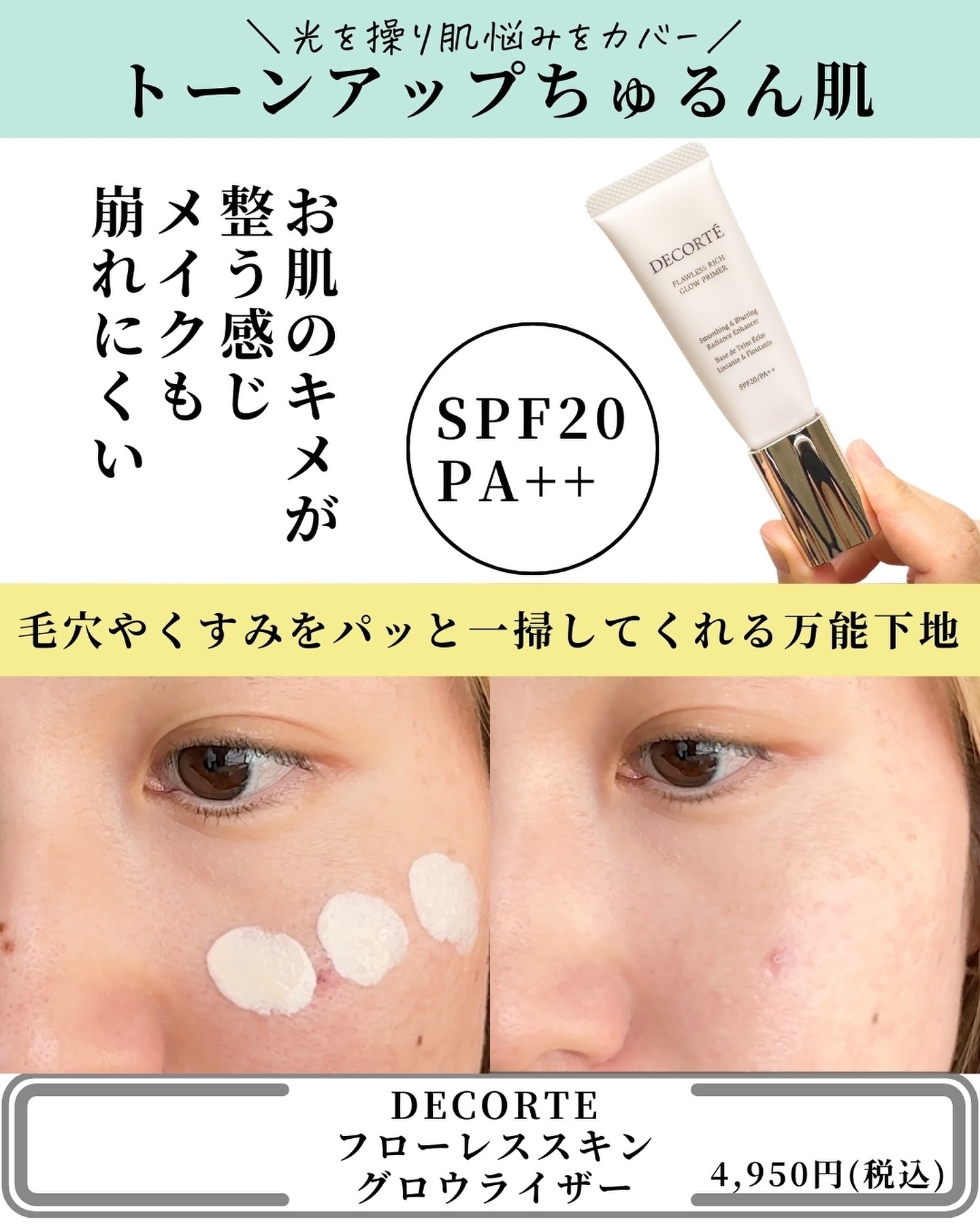 @mimimi_cosme◁他の投稿はこちら👈【ツヤは下地で仕込め✨】年中ツヤ肌命!のコスメ狂いOLが推すツヤ肌下地6選😇-—商品情報-—♦︎LAURAMERCIER@journaldelmピュアキャンパスプライマーイルミネーティングNトラベルサイズ2,970円(税込)♦︎RMK@rmkofficialルミナスメイクアップベース4,400円(税込)♦︎DECORTE@decorte_officialフローレススキングロウライザー4,950円(税込)ロージーグロウライザー3,520円(税込)♦︎Dior@diorbeautyディオールスキンフォーエバーグロウヴェール7,370円(税込)♦︎ALBION@albion_jpアルビオンスタジオリングライトエフェクター3,850円(税込)—————オールシーズンツヤ肌「命」なコスメ狂いOLみみみです🙋🏻♀️今回は、コスメ狂いOLがおすすめするデパコスツヤ肌下地まとめだよ!デパコス下地どれ買おうか迷ってる人、ツヤ下地好きの人ぜひぜひ参考にしてみてねそれじゃあ早速それぞれの下地の特徴いってみよ〜👇♦︎LAURAMERCIERピュアキャンパスプライマーイルミネーティングNトラベルサイズお肌の潤いをチャージしながら気になるお肌のアラをぼかしてくれるよ!肌馴染みのいいピーチパールだからナチュラルなツヤ🍑♦︎RMKルミナスメイクアップベース潤って上からのせるファンデーションの仕上がりを上げてくれる⬆️お肌の凹凸も気になりにくくしてくれるじゅわっとツヤ✨♦︎DECORTEフローレススキングロウライザーお肌のキメが整う感じがするツヤ下地。毛穴やくすみを一掃してくれるトーンアップ下地🧹♦︎DECORTEロージーグロウライザーツヤラバーさんにはこれがおすすめ🥰🔥とにかくつやんつやんになれる神的なツヤ下地♦︎Diorディオールスキンフォーエバーグロウヴェール美容液ベースで乾燥しにくいツヤ下地ファンデの仕上がりもUP🫶お肌の調子も悪化しにくいのも嬉しい♦︎ALBIONアルビオンスタジオリングライトエフェクター色むらカバー力もあるセミファンデ。トーンアップと絶妙なツヤがお気に入り🩷ってな感じでコスメ狂いOLがおすすめするツヤ下地まとめでした〜👼みんなはどの下地が気になった?コメント&DMでぜひ教えてね〜🩷んじゃまたね〜👋👋👋みみみ————————————@mimimi_cosmeではコスメ狂いOLが贈る失敗しないコスメレビューをしてるよ🙋🏻♀️コスメ選びのご参考にっ!よかったらプロフィール飛んでね💄————————————#メイク#ベースメイク#下地#ローラメルシエ#lauramercier#rmk#decorte#コスメデコルテ#ディオール#albion#アルビオン#秋の自分磨きレシピ
