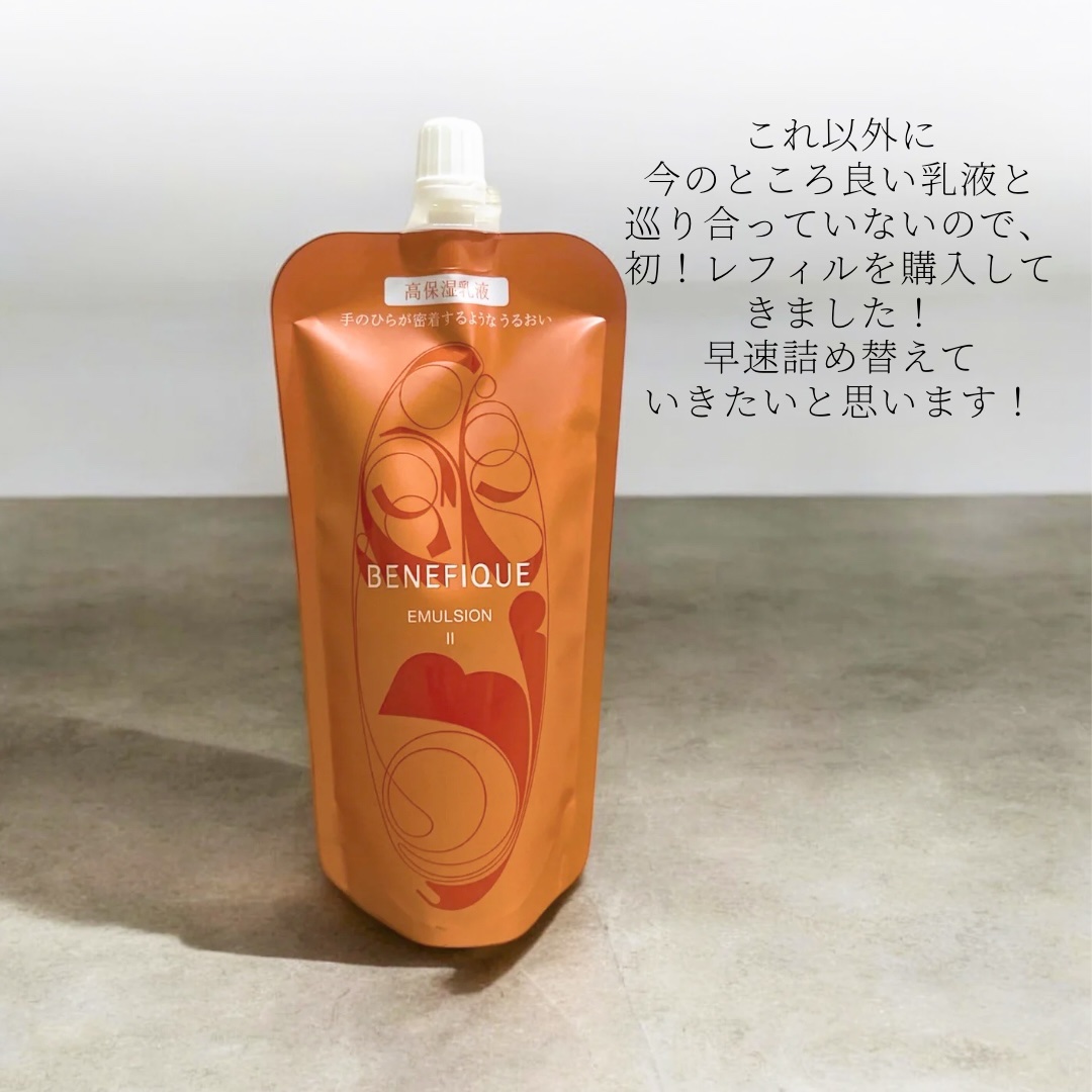 \乾燥と美白対策したい私にぴったり乳液見つけた👀/┈┈┈┈┈┈┈❁❁❁┈┈┈┈┈┈┈┈ベネフィークエマルジョンII130ml(レフィル)4,840円/150ml6,050円┈┈┈┈┈┈┈❁❁❁┈┈┈┈┈┈┈┈💎冬の乾燥も怖くない!隙のないキメ美肌を叶える乳液💎体調を崩していて暫く更新が出来ておりませんでした…ごめんなさい😢数年前、資生堂の美容部員さんと仲良くなったのをきっかけに使い始めたベネフィーク💗今日はその中でも今回初めて購入し、使い切った「エマルジョンII」をご紹介します✨🌿商品ポイント(個人的まとめ)①濃密保湿でみずみずしいキメ美肌へ角層細胞ひとつひとつにうるおいを閉じ込め、毛穴の目立たない隙のない肌に導いてくれる高保湿乳液✨乾燥が気になる冬の肌を優しく守ってくれます!②シミ・そばかす予防も◎美白ケアができるのも個人的に嬉しいポイント!メラニンの生成を抑え、透明感のある肌へと導いてくれる頼れる1本です✨③しっかり保湿の重めテクスチャー「Ⅱ」のタイプは特にしっとり濃厚。乾燥しがちな肌もしっかりうるおしてくれるから、冬でも安心して使えます❄️⛄️使用感レポート昨年から使い始めて今回1本使い切り、その後迷わずリピートしました!いろいろな乳液を試していますが、今のところ大満足◎特に冬の乾燥が気になる今のような季節には欠かせない濃厚さとしっとり感で、頼れる存在だなと思います😌💡プチ悩み&注意点詰め替えのときにどうしても手元が狂ってこぼしてしまうのが私の失敗ポイント😖(これ、私だけ?😂)乳液を床に付着させると拭き取るのも一苦労なので、皆さんはぜひ慎重に詰め替えてくださいね!笑笑🌟次に気になっているアイテム実は「エマルジョンEXII」という上位モデルも気になっています💎今はこの「II」で様子を見ていますが、いずれはランクアップしてさらに保湿力を体感してみたいなと思っています!(まとめ)❄️冬の乾燥対策におすすめ!特に乾燥肌や美白ケアを気にしている方には本当にぴったりな商品だと思います!これ1本で肌のうるおいも透明感もキープできるから、日々のスキンケアがもっと楽しくなるはず。ぜひチェックしてみてください✨#ベネフィークエマルジョンII#ベネフィーク#BENEFIQUE#資生堂スキンケア#購入品#使い切り#使い切りレポ#乳液#エマルジョン#乾燥肌#乾燥肌対策#美白ケア#スキンケア#冬のスキンケア#初買いコスメレビュー