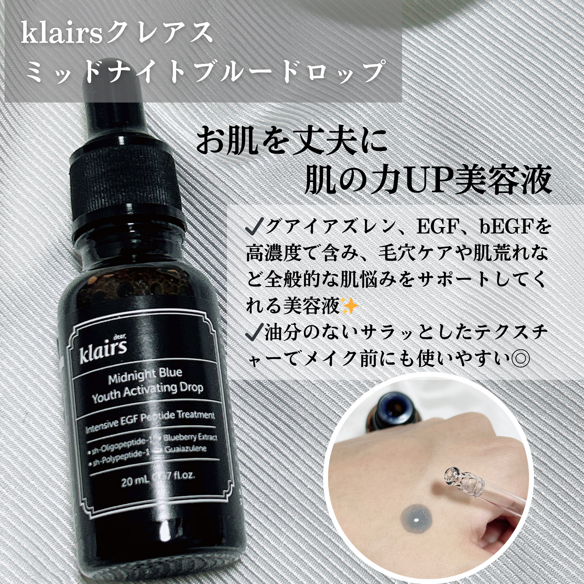💙klairsクレアスミッドナイトブルードロップミッドナイトブルークリーム#PR🟦どうして青いの?自然由来成分「グアイアズレン」が主成分として配合されているから。本来は紫色に近い濃い青色を帯びた成分の為、配合される過程でブルーカラーになったらしい!グアイアズレン…カモミールの花から少量しか抽出されない貴重な成分EGFペプチド…肌を保湿する事で肌ツヤをサポート乾燥や紫外線による肌のほてりや、ハリ不足が気になる方におすすめ!お肌を保湿してハリのある肌や、肌トラブルをケアしてくれます肌荒れを全般的にサポートしてくれます✨💙ミッドナイトブルードロップ→毎日朝と夜に💙ミッドナイトブルークリーム→寝る前に使うのがおすすめ!#クレアス#klairs#ミッドナイトブルークリーム#ミッドナイトブルードロップ#ミッドナイトセット#韓国コスメ#Qoo10メガ割#韓国スキンケア#保湿クリーム#敏感肌#低刺激#保湿#乾燥肌#鎮静ケア#肌荒れ#もち肌スキンケア#Qoo10#毛穴ケア#ナイトクリーム