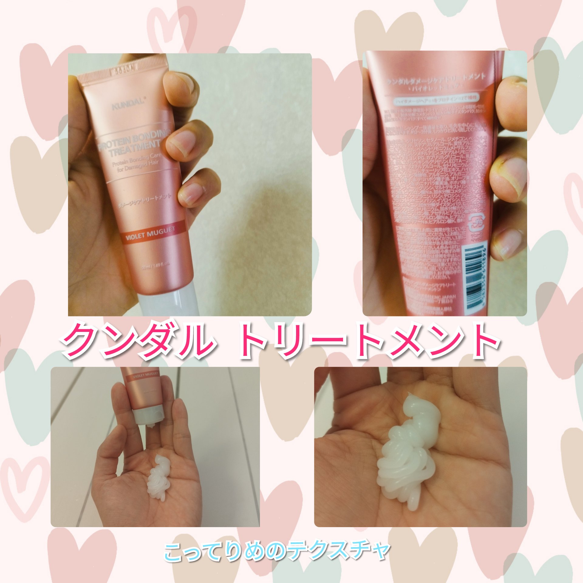 KUNDAL ダメージケアトリートメントですこちらはバイオレットミュゲの香り✨少しテクスチャーが固めで若干馴染ませにくい気も🤔個人的にはそこまで気にならないです洗い流したあとは髪がしっかりする感じがして、重たすぎず軽すぎなくてちょうど良いなと感じました👍香りも甘すぎず濃すぎずめちゃくちゃ良い香りでした🥰現品サイズが気になります✨#プチプラ#韓国コスメ#ヘアケア#梅雨に負けないヘアケア