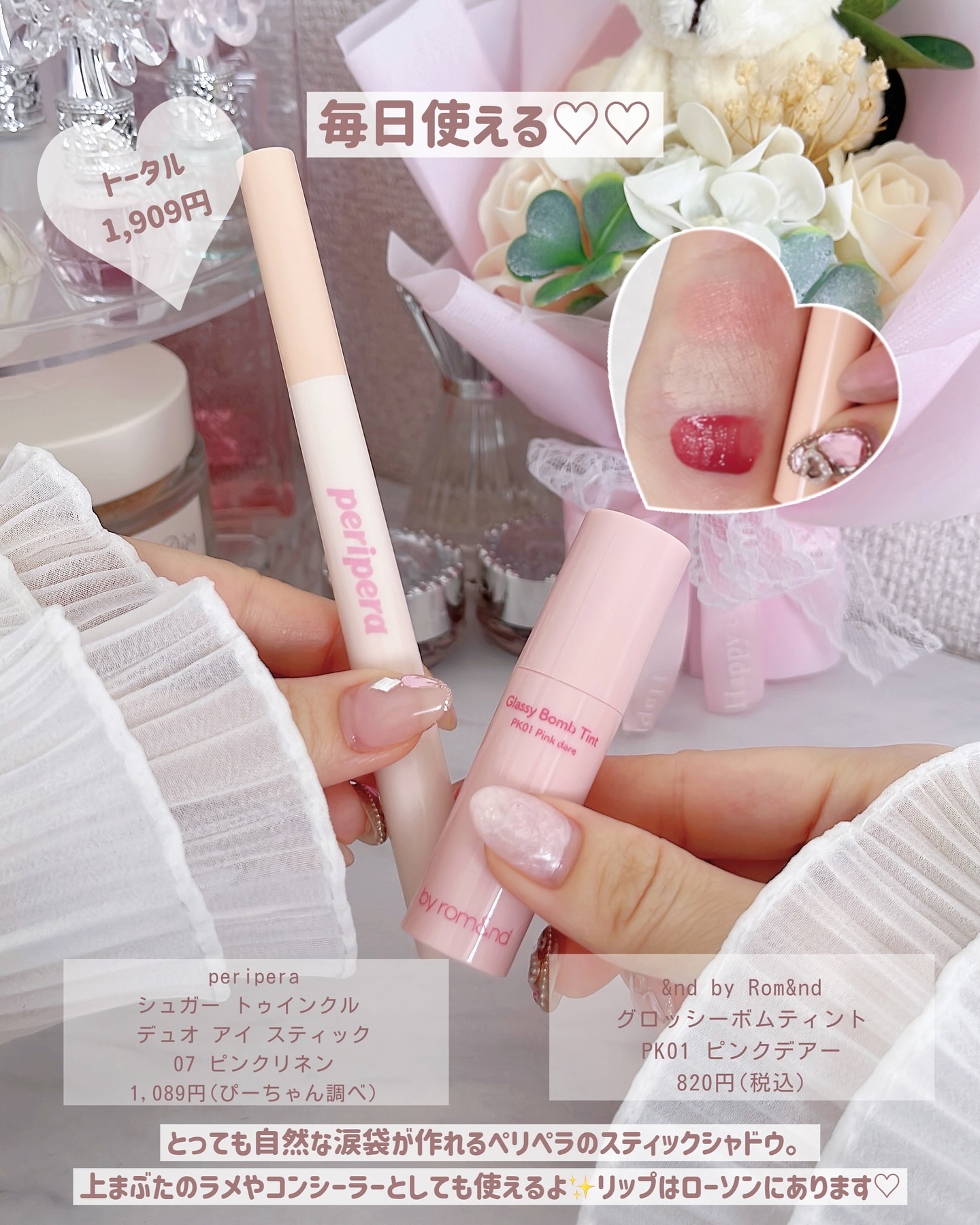 2,670円 @andbyromand メロウアイパレット @romand_jp グラスティングカラーグロス 1,909円 @periperajapan シュガー トゥインクル デュオ アイ スティック @andbyromand グロッシーボムティント 1,518円 @cezannecosmetics ペールトーンアイシャドウ @canmaketokyo むちぷるティント