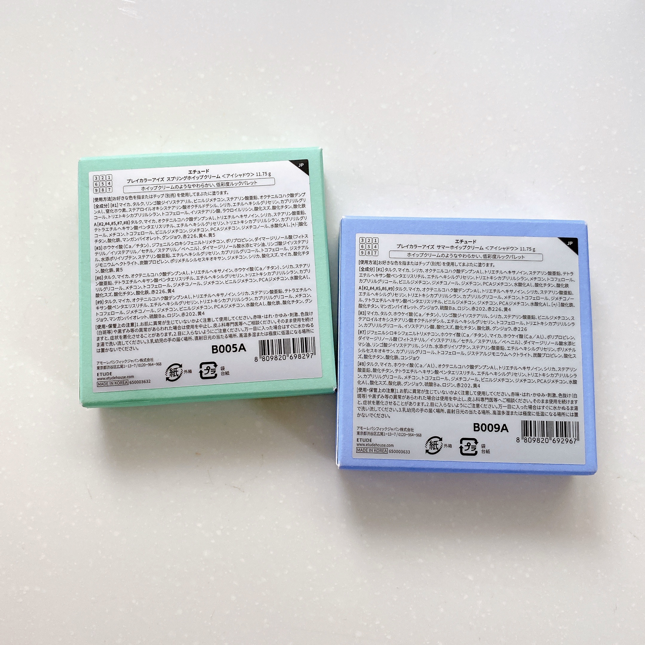 既存のエチュードのアイシャドウより粉質がほわほわで柔らかいように感じました😍 マット、グリッターだけでなくパール入りマットやシマーカラーまで入っていて万能すぎる◎ どちらも白み+落ち着きのある低彩度カラーで大好物すぎます🤤