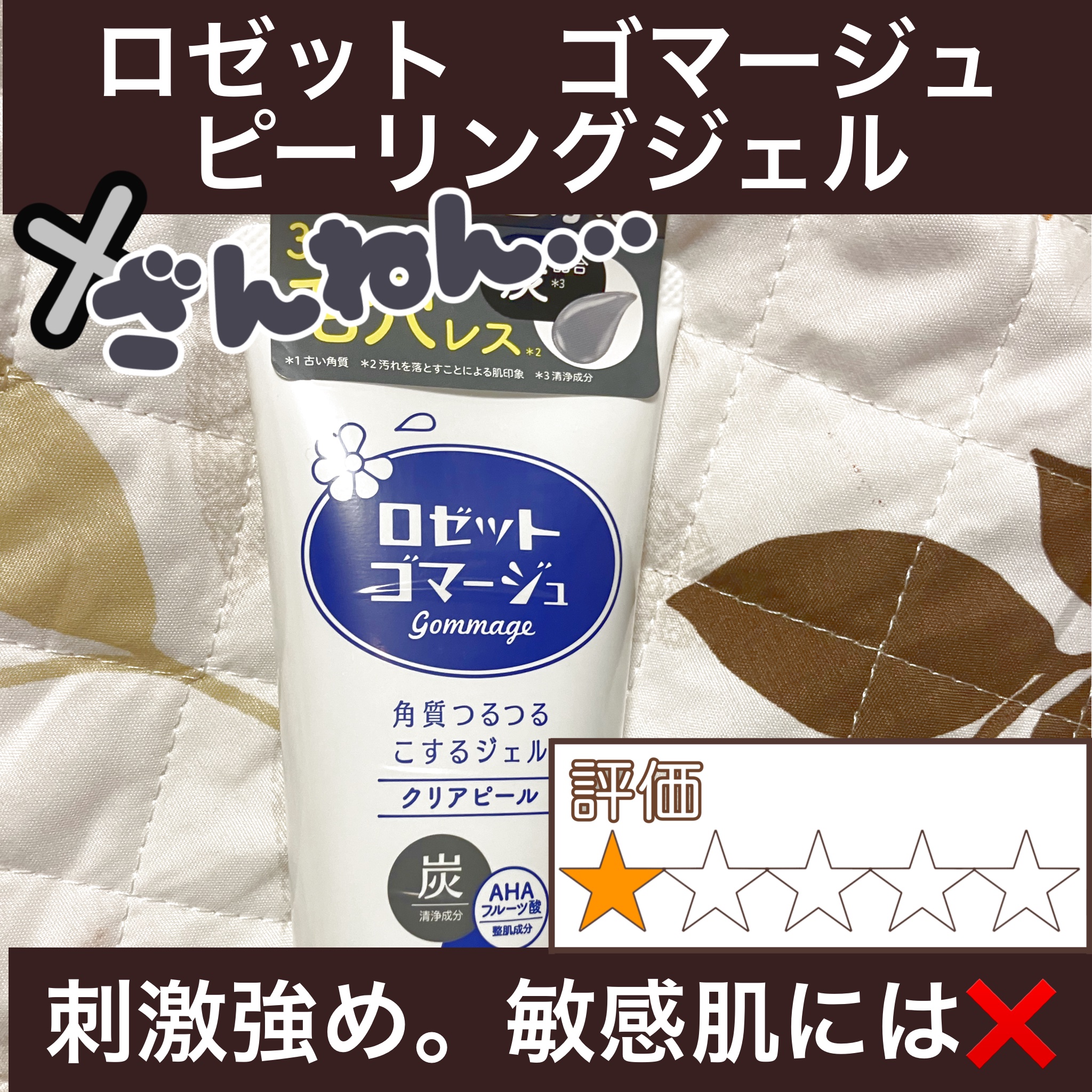 【商品名】・ロゼット ゴマージュ ピーリングジェル整肌成分(乳酸、クエン酸、りんご酸)配合のピーリングジェルとのこと。【テクスチャー】半透明の黒色ジェルです。【使用感】◎濡れた肌にも使える。◎洗浄力あり、使用後はベトベト感なし。◎洗い流しが比較的楽。△クリアサボンの香り。私的にはきつい香りに感じる。✖️鼻の角栓にほぼ効果無し。(毛穴洗顔料を使用した方がまし)✖️肌荒れする。(私は摩擦にならないよう優しくマッサージしましたが、かなりピリピリする。すぐ顔が赤くなりニキビができてしまいました。)<個人的な感想>濡れた肌に使用できる点は優秀だと思いますが、私の肌には相性があいませんでした。優しくクルクルしたつもりが流した瞬間ピリピリしてしまい、数分後にでき物もできてしまいました。これだけ肌に負担がかかるのに肝心な毛穴汚れ角栓は期待するほど落ちませんでした。別日に使用しても同じ反応が出たので、かなりの敏感肌の方には注意。毛穴詰まりは抜きにして、洗浄力を求めている方にはこの商品良いかも。*あくまで個人の感想なのでご参考までにお願いします。最後までご覧いただきありがとうございました。#ロゼット #ベストコスメ#LIPSベスコス使ってみた#角質ケア#ピーリング#毛穴ケア