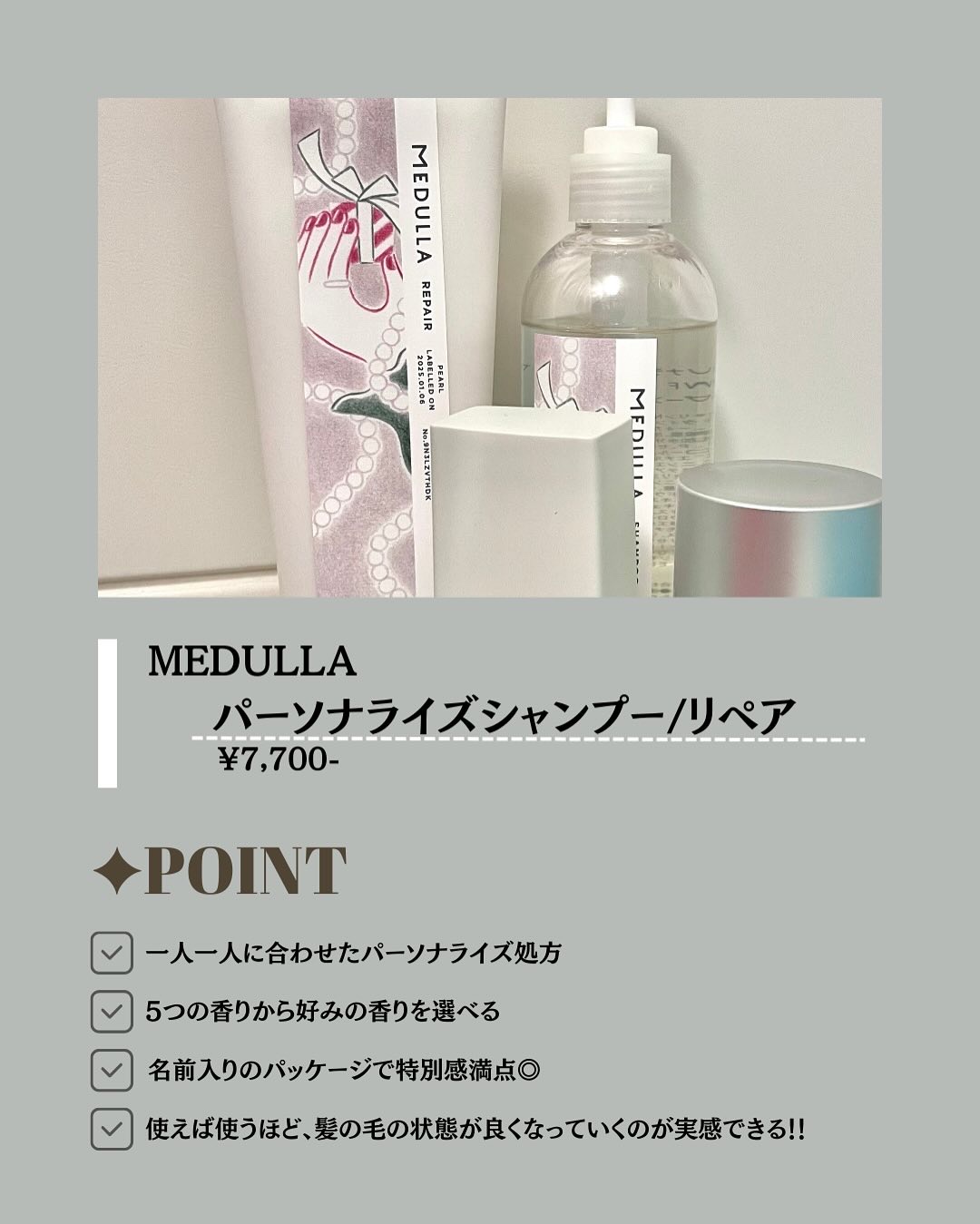 MEDULLA【シャンプー&リペア】診断をしてくれて自分の髪質にあったものを届けてくれます!香りはジャスミンやローズなどが配合されていて甘すぎず、でも女性らしい香りです🤍使ってみた感想は可もなく不可もなくと言った感じでこれじゃなきゃ!とはならなかったです定期購入ですが、すぐに停止できるので手軽に試せるところはいいなと思いました◎