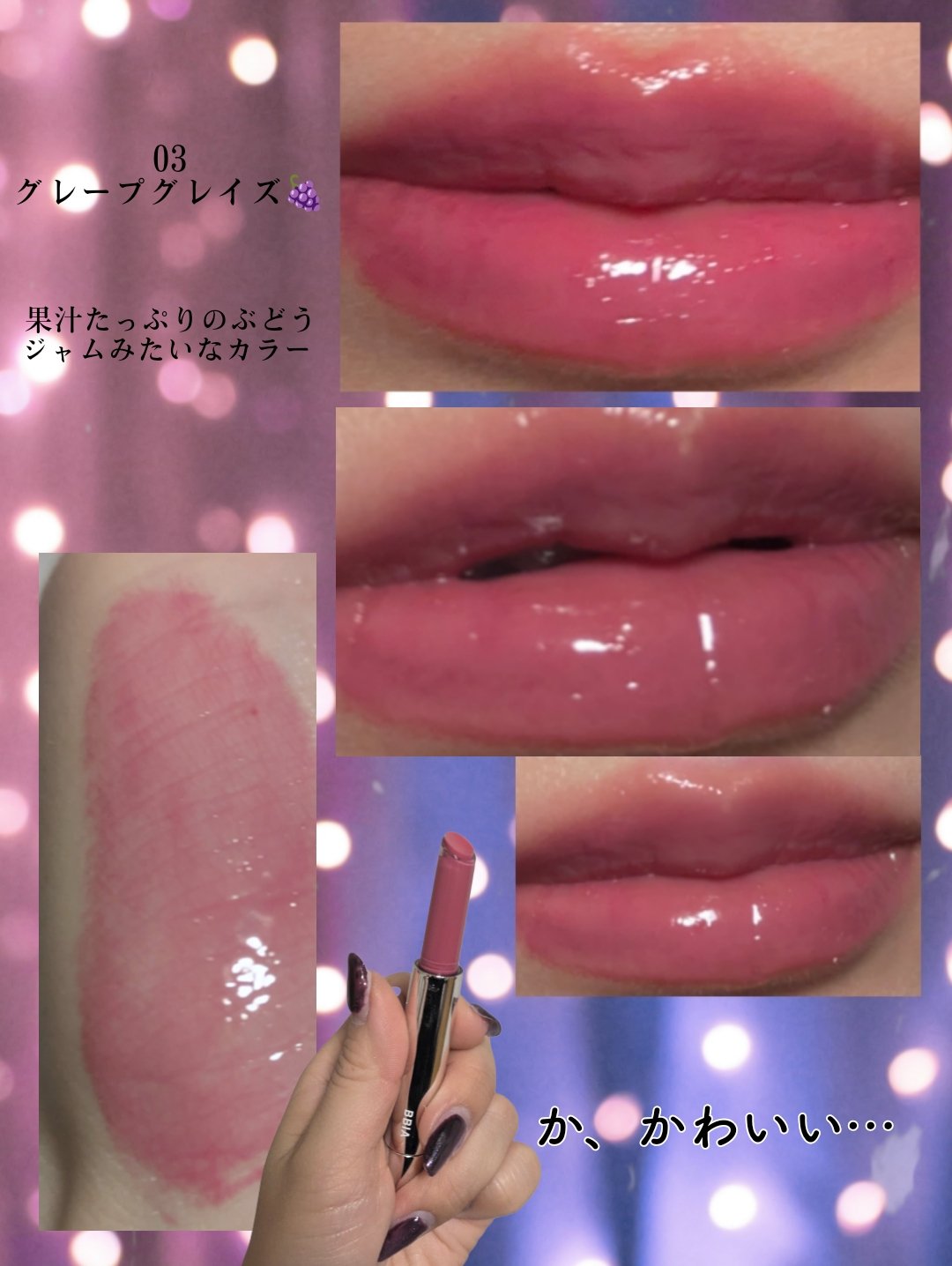 シロップでコーティングしたような立体的な光沢感がかわいい……! とろけるバームタイプで唇の体温で溶けてするするぬれてちゅるちゅるに💓 おいしそうなカラバリで他にはなかなかないカラーもあったりと、どのカラーも可愛い! 重ねても濁らない澄んだカラー🫶 ほんのりスースーする、優しいプランプ効果もあってふっくらとした仕上がりに! わたしのお気に入りはお察しの通り03.04なんだけど普段使わないカラーもシアーだから使いやすかった🫣💓