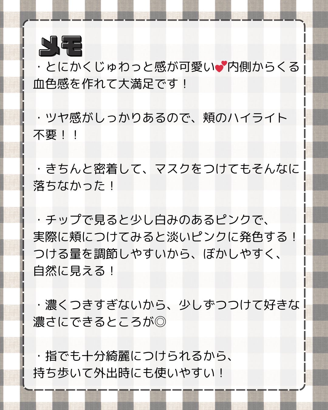 じゅわっとツヤ肌でいまどきなメイクができるます!! このピーチ系のほんわか優しいカラーほんとに大好きで、質感もツヤになるし、発色も濃すぎたりしないので調整しやすく、ムラにもならなくて使いやすい!! ベースにリキッドを仕込んで、上から他のチークを重ね付けしても可愛い😍