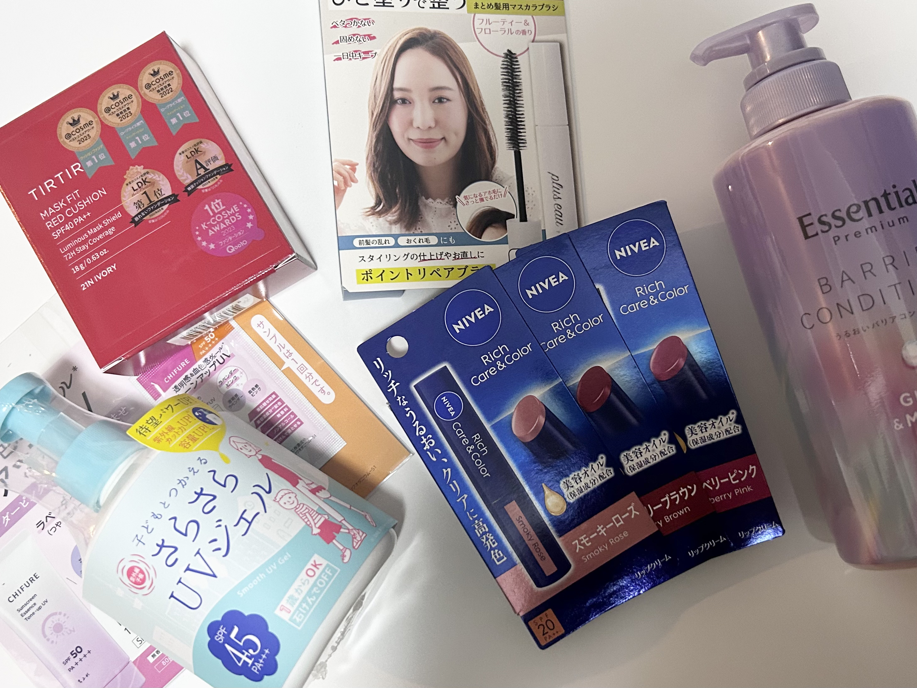 #コスメ購入品lipsでまたまたお買い物♫全部リピート品です。🧡紫外線予報さらさらUVジェルFポンプタイプで服にも色移りしないからすごく使いやすい。さらさらの塗り心地も最高。🧡TIRTIR マスクフィットレッドクッション安定のティルティル。ピンク、白、赤のクッションの中で赤が1番好きかな。赤はリキッドも愛用中。🧡ニベアリッチケア&カラーリップ3色一気買いしました笑この前スモーキーローズを買って気に入ったので、スモーキーローズもう一本と、気になっていたチェリーブラウン、ラズベリーピンクも買い足し。🧡pluseau ポイントリペアスーパーハードタイプよりこっちの方が好き。スーパーハードは塗って乾くと少しかたくなるけど、これは髪の毛がかたまらない。🧡エッセンシャルプレミアムうるおいバリアコンディショナーグロウ&モイスト今使ってて、コンディショナーだけ買い足しました⭐︎シャンコンのリピートはそこまで多くないけど、これ好き。