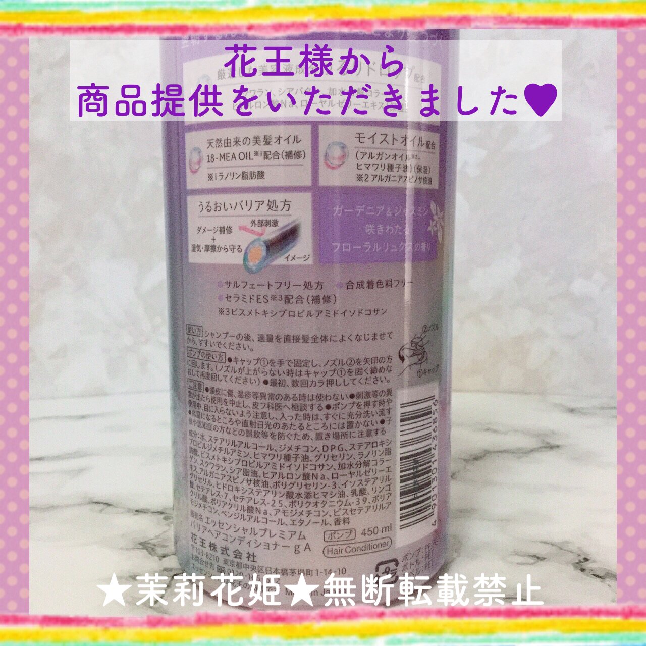 #PR#花王【全成分/バリアコンディショナー】水、ステアリルアルコール、ジメチコン、DPG、ステアロキシプロピルジメチルアミン、ヒマワリ種子油、グリセリン、ラノリン脂肪酸、ビスメトキシプロピルアミドイソドコサン、加水分解コラーゲン、スクワラン、シア脂油、ヒアルロン酸Na、ローヤルゼリーエキス、アルガニアスピノサ核油、ポリグリセリン-3、イソステアリルグリセリル、ヒドロキシステアリン酸水添ヒマシ油、乳酸、リンゴ酸、セテアレス-7、セテアレス-25、ポリクオタニウム-39、ポリアクリル酸、ポリアクリル酸Na、アモジメチコン、ビスセテアリルアモジメチコン、ベンジルアルコール、エタノール、香料【商品説明】商品名:エッセンシャルプレミアムバリアコンディショナーグロウ&モイスト販売名:エッセンシャルプレミアムバリアヘアコンディショナーgA容量:本体450mL【特長】パワーアップしてリニューアル新発売昨年クチコミサイトや様々なSNSで話題となったエッセンシャルバリアシャンプーコンディショナーが新しく2種展開になって追加発売!◆こんな人におすすめ!・時間が経つと乾燥うねり※1や広がりが気になる方・うるおいまとまり髪が理想な方※1乾燥によるとろふわスフレ泡でやさしく洗う!うるおいバリア処方で傷んだ髪を集中補修&コート!今回の商品のこだわりポイントはアミノ酸洗浄成分に花王独自原料を組み合わせることで実現した”とろふわスフレ泡”♪バリアシャンプーはスフレ泡が髪全体にしっかりと行きわたり、髪同士の摩擦を防いで洗えます。泡切れも良く、するすると流せます。ブロー後の仕上がりも◎うるおいバリア処方で、カラーやブリーチ、パーマなどで傷んだ髪を集中補修&コート。さらに、その良い髪の状態を守りつづけるように研究を重ね、「日中も髪がまとまる」「湿気・摩擦から髪を守る」ことを実現しました。厳選した美容液成分うるりドロップ配合(保湿)韓国コスメやスキンケア品を参考に成分を厳選。スクワラン、シアバター、加水分解コラーゲン・ヒアルロン酸Na・ローヤルゼリーエキス(保湿)を配合し、パワーアップ!【原産地】MadeinJapan【香り】ガーデニア&ジャスミン咲きわたるフローラルリュクスの香り *★*―――――*★*花王様からご提供いただきました、エッセンシャルプレミアムバリアコンディショナーグロウ&モイストのモニターをさせていただきました。ありがとうございます。重めのテクスチャーですが、馴染ませやすく、使い心地も良かったです💗毛先の痛みと雨の日の広がりが気になる私にはピッタリでした♪フローラルリュクスの香りも華やかで好きな香りで気に入りました。雨の日や乾燥した日も、しなやかにまとまる事を願い、今後も使い続けたいなと思います。今回はモニターとして素敵な商品をありがとうございました。また機会がありましたら、宜しくお願い致します♪#エッセンシャル#翌朝感動シャンプー#ヘアケア#シャンプー#エッセンシャルプレミアム#コンディショナー#Ripre#Ripreモニター#モニター