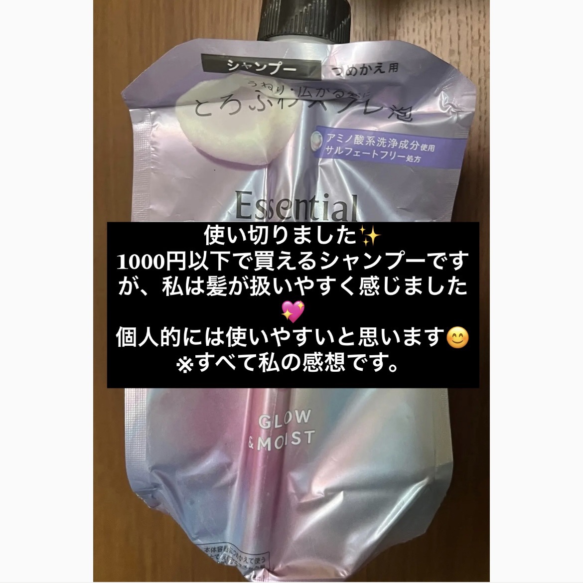 【使った商品】エッセンシャルプレミアムうるおいバリアシャンプー/コンディショナーグロウ&モイスト【香り】好みが分かれると思う。デパートのコスメコーナーみたいな⋯ちょっと甘ったるい感じの匂いで、結構残る。【テクスチャ】普通【どんな人におすすめ?】今までいち髪とかサロン専売みたいな更に洗浄力の弱いシャンプーを使ってて、もう少しだけ洗浄力が欲しいなっていう人✼••┈┈••✼••┈┈••✼••┈┈••✼••┈┈••✼100均の200mlポンプに詰め替えて使っています。元々ナプラのケアテクトを使用していたのですが、もう少しさっぱり洗い上げたかったので購入。これがちょうど良い洗浄力で大当たり!泡立ちも上記のものより格段に良いです。ただ、ガッツリヘアオイルとかワックスとかスプレーする人は泡立ち悪かったり物足りなかったりのはずなので、プレシャンプーするか更に洗浄力高め(サロンリンクの青いのとか)を選んだほうが良いと思います。私は基本的にヘアドライ時に揮発性シリコンのミストとホホバオイルベースのクリーム、朝はクリームにマカデミアナッツオイルちょい足ししたもので軽くセットするくらいであまり皮膜蓄積多くないので1回の洗浄でちょうどいいです。このシャンプーに限らないですが、ノンシリコンシャンプーなので今までシリコン入り使っていた人ははじめのうちは蓄積された皮膜が取れて軋む可能性があります。