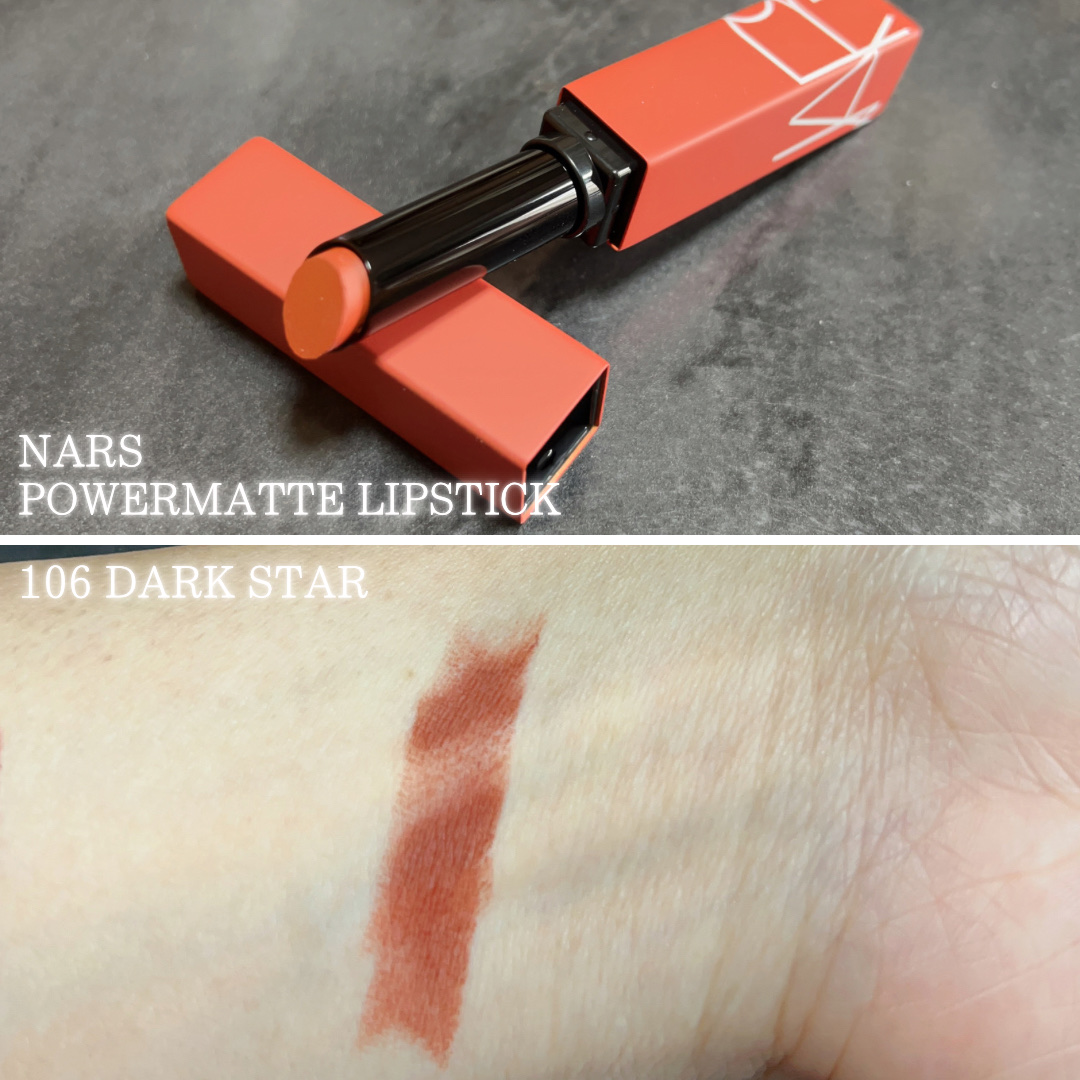 カッコいいお洒落な若干オレンジっぽいブラウンリップですしっかり塗ってカッコいい雰囲気にしても良しブラシでぼかすしてふんわり優しさを出しても良し塗りやすいタイプですが、しっかりマットなのでリップベースを仕込んでから塗布したほうが仕上がりキレイになるかと思います✨ブラウンリップの入門にも👍カラー名はDARKSTARですが、そこまで沈まない印象です!NARSのリップは初めてでしたが皮むけもなく色持ちも抜群で大当たりでした~