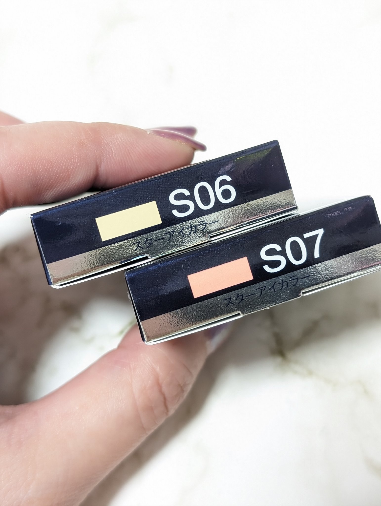 4月18日発売の新色 エレガンス ラズル スターアイカラー✨ S06 インクレディブルホワイト 水色っぽいホワイトにゴールドラメ✨ S08 クラッシュピンク 青みがかったパープル感もあるピンク🩷