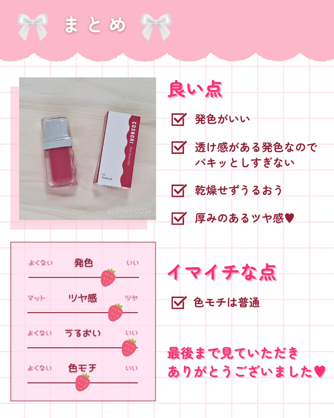 🌿うるちゅるツヤ感✨️ブルベ向けベリーピンク🌿COSNORIフローウェーブティント02 ピンクラッシュQoo10公式で購入1,700円→740円(税込)購入品紹介▶️https://lipscosme.com/posts/7930326プレメ...