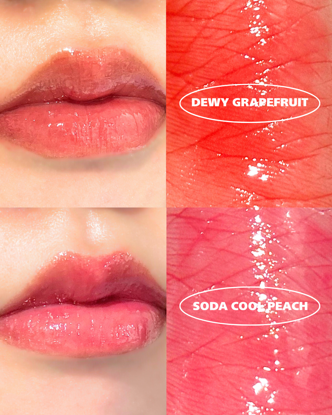 サラッと軽いテクスチャで、重ねても負担を感じず 一度塗りだと透け感しっかり さらに重ね塗りするほど発色豊かでモチモチに🥹✨ じゅわっと滲み出るような水分感・光沢感が綺麗で、 ティントだけでも十分すぎるかわいさ。 02の上から00を重ねると、よりボリューム感とツヤがアップしてタンフルっぽい仕上がりに🍭