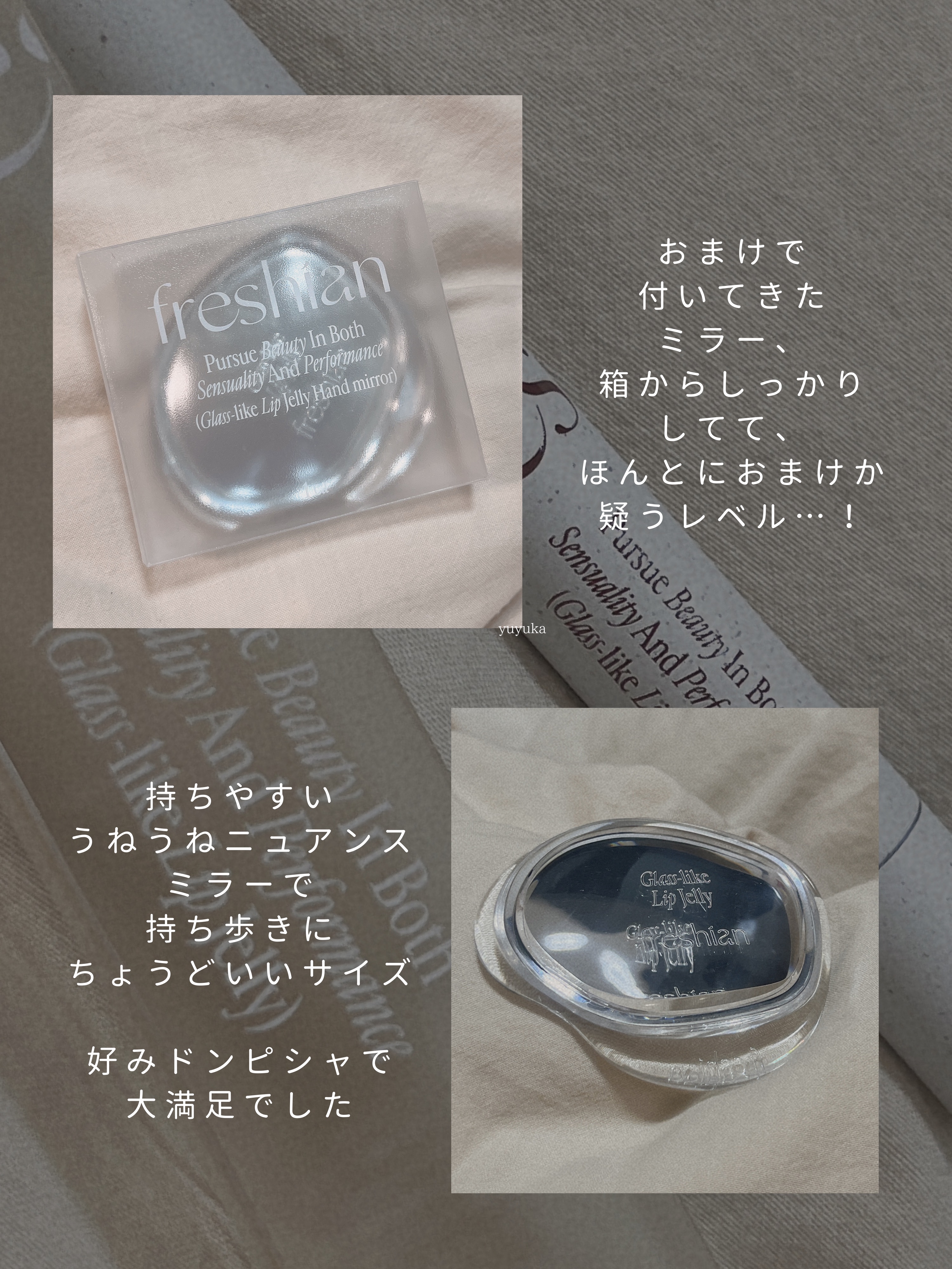 ˗ˏˋとりあえずカバンに入れておくだけでおしゃれ&実用的パケ買いリップˎˊ˗✼••┈┈••✼••┈┈••✼••┈┈••✼••┈┈••✼✼••┈┈••✼••┈┈••✼••┈┈••✼••┈┈••✼‹ɪᴛᴇᴍ›freshianグラスライクリップジェリー06Bitter‹ᴘᴏɪɴᴛ›重厚感のあるパケで高見え。パケの質感、フォントがおしゃれ…06Bitterはイエベ秋向きの赤みブラウンカラーうるうる感が可愛くて、保湿もしっかりプランプアップと記載ありましたが、個人的にひりひり感なく驚きました😳おまけのミラーがおまけ超えてて大満足ほそみで塗りやすく、シアーな発色なので朝しっかりメイクできずとりあえず血色感だしたいって時や、唇カサついてるけど保湿リップ→カラーリップの工程省きたいときに良すぎるし、カバンに入ってるだけでオシャレ感ましましで上半期トップレベルに好きなアイテムでした…!最後まで見てくださってありがとうございます!#はじける果実感コスメ#韓国コスメ#パケ買いコスメ#イエベ秋#Qoo10#リップ
