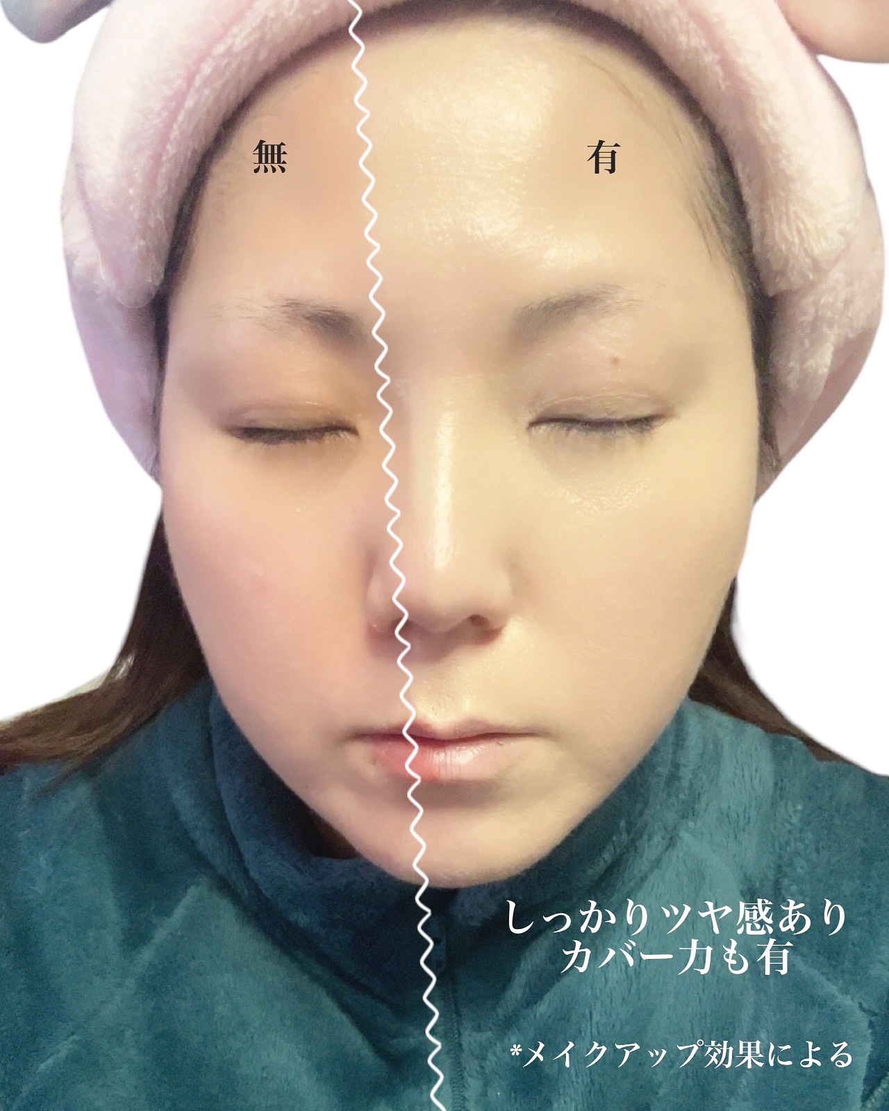 ぷっくりしたハートです。それも、淡いピンクなのがまた可愛い。 こちらの特長は、まるで自分の肌のような「自然なカバー力」と、輝くような「ツヤ肌」を長時間維持するということみたい。 厚塗り感もなく、均一な肌トーンですね。