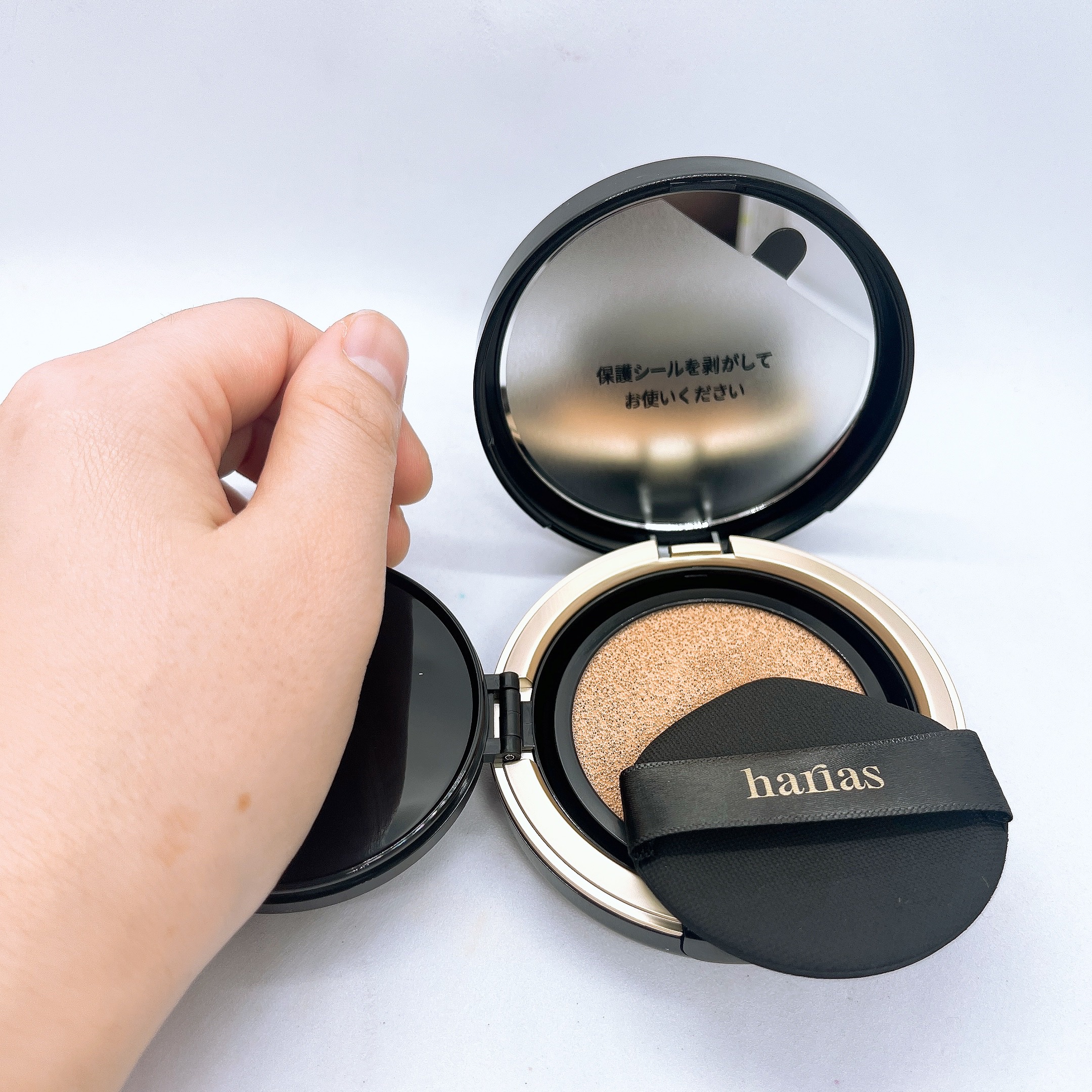 「ハリアス 薬用クッションファンデーション ベージュ」を使ってみました。黒色のパッケージで、文字は白色でした。開けてみると、パッケージと同じ黒色のファンデーションが出てきました。パクトを開けると、ゴールドで縁取られていて上品な印象でした。パフ...