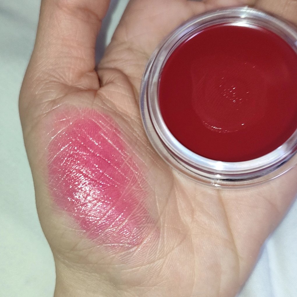 リップとしてもチークとしても使えるクリームタイプのバーム。 パキッとした鮮やかなレッドカラーに惹かれて購入。 テクスチャは割と柔らかめで軽く触れるだけでもしっかり取れるのでコスパ最強。 高発色だけど広げやすくてチークとしての使いやすさは️⭕️ 実際肌に乗せるとチェリーレッドのような若干ピンクっぽさも感じる赤に発色する。 見た目よりも深みが無いから自然な赤みを出せてむしろありがたいかな🙏
