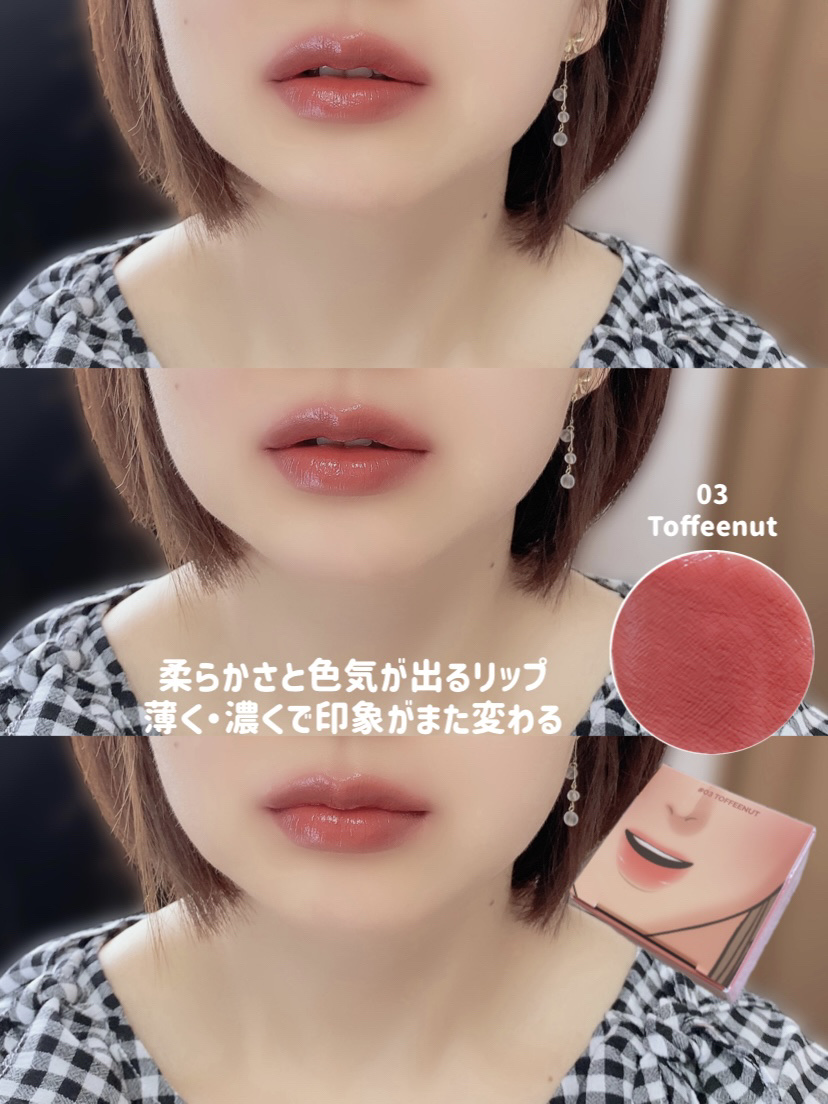 体温でとろけるメルティングバームテクスチャーで、健康的で明るくもちもちとした印象の肌に! 水分をロックする膜を形成してしっとり感をキープしてくれます🫧 03トフィーナッツは大人ローズベージュカラー🌹 想像していたよりも赤みのあるカラーでした じゅわっと血色感が出てお気に入り