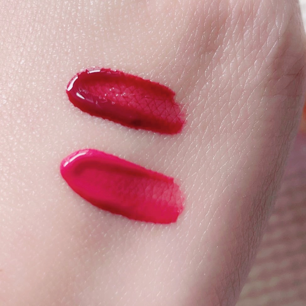 CipiCipiデューイフィルムティント03クールガールLakaフルーティーグラムティント#115エンヴィ(ミニサイズ)どっちも鮮やかな青みレッドの人喰いリップ系で似てるかなーと思って比べてみたんだけどLakaの方が濃くて紫っぽいかな?くすみ...