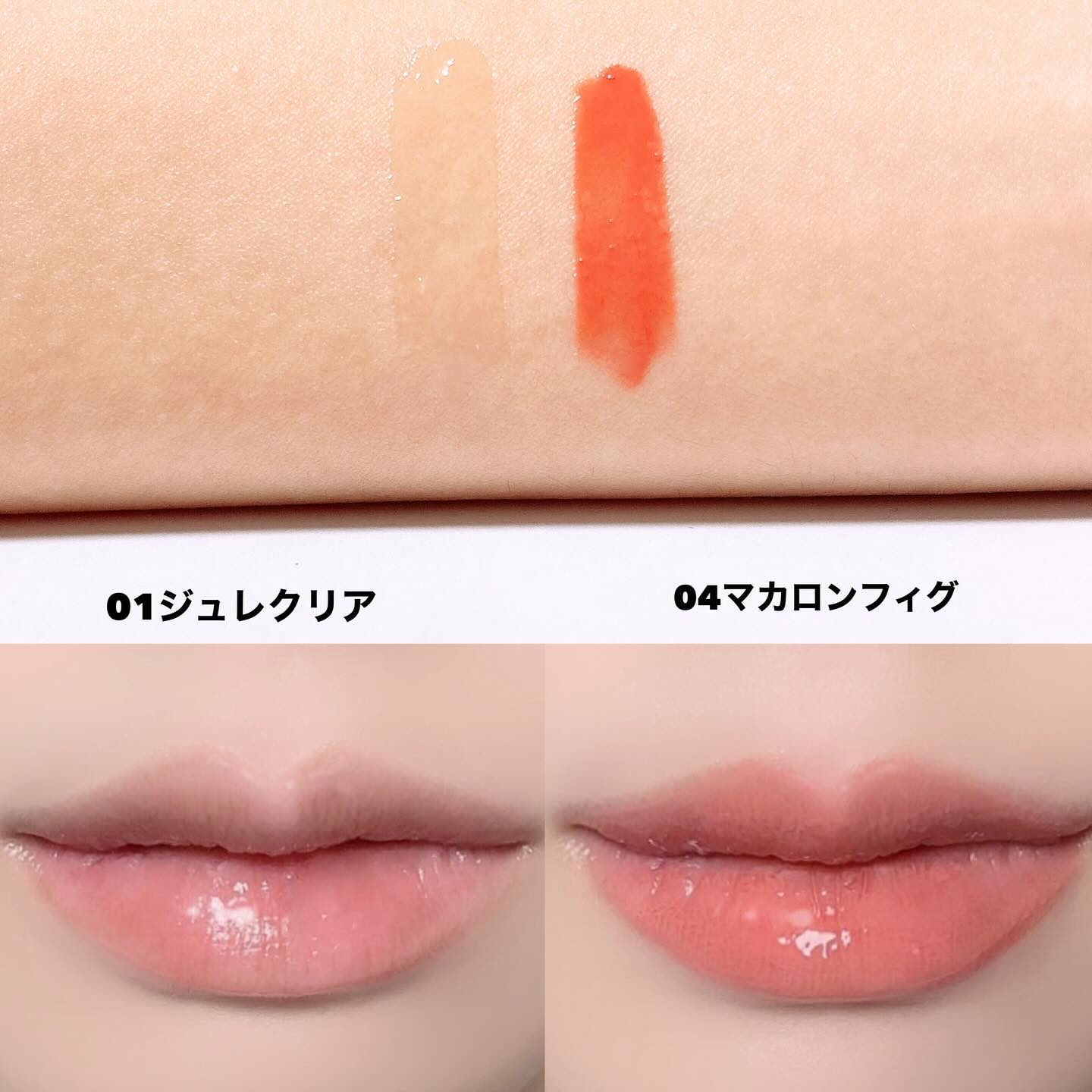01ジュレクリアはプランパーとして口紅前に使ったり グロスとして口紅後に使ったり単品使いもできるマルチなクリアカラー 粘膜カラーでナチュラルに血色感が出せる 04マカロンフィグ ブルべに合わせやすいふんわりピンク メイクアップしながらリップケアもできちゃう @cosmeなどで購入できるのでぜひチェックしてみてくださいね✨