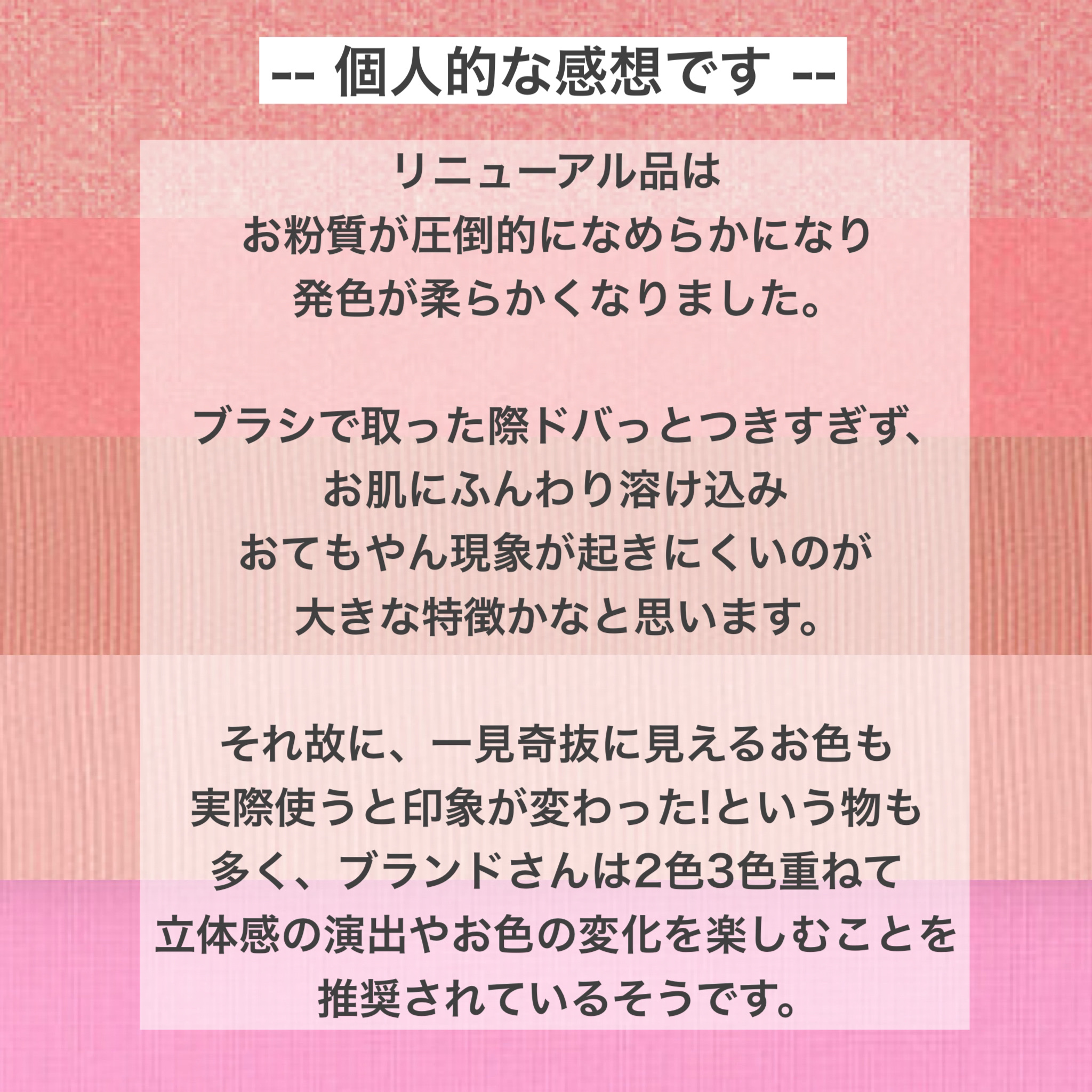 リニューアル前のものです。 自分の記録用に 高発色、アイシャドウに使っても可愛い 微細なゴールドパールで血色感のある印象に ゴールドパールが散りばめられたオレンジベージュでヘルシーな印象に どんなシーンにも使いやすい万能カラー マットで柔らかな発色、肌馴染みバツグン
