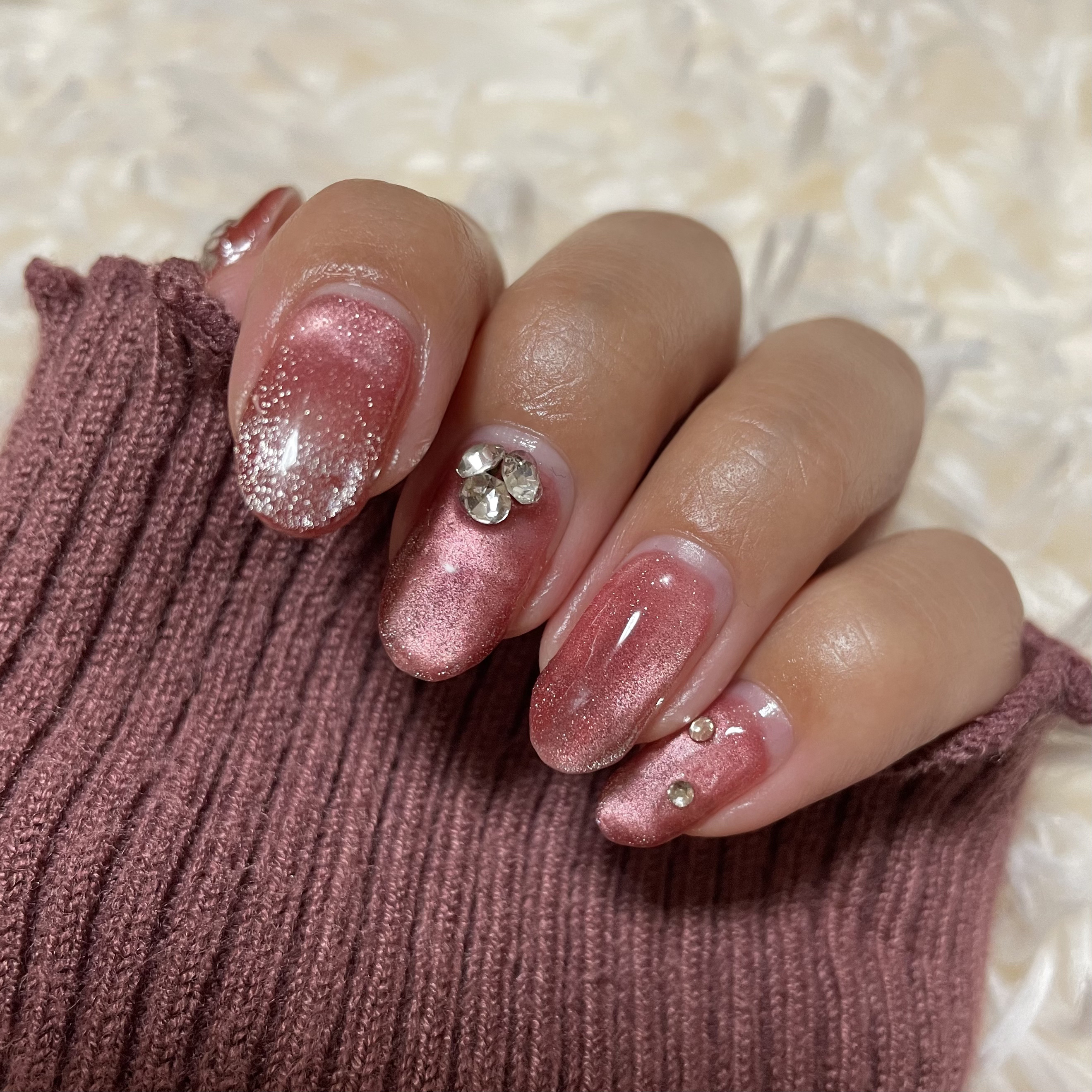 秋をイメージして赤みピンクっぽいマグネットでつやっと仕上げました!!! 角度が変わるたびキラキラしてとっても可愛いです!! 赤みピンクに合わせてゴールドのミラーパウダーを組み合わせました✨ 親指のハートをぷっくりさせているのもお気に入りポイント💡