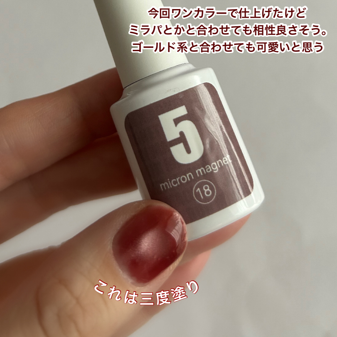 ネイル工房 5ミクロンマグネット 18です!!ブラウンよりのピンクで秋冬に合う感じがします🫶写真は2度塗りのフレンチマグにしていますが全面光らせてもかわいかったです!!マグネットも動かしやすいし、マグネットが繊細でツヤツヤだしネイル工房さんの...