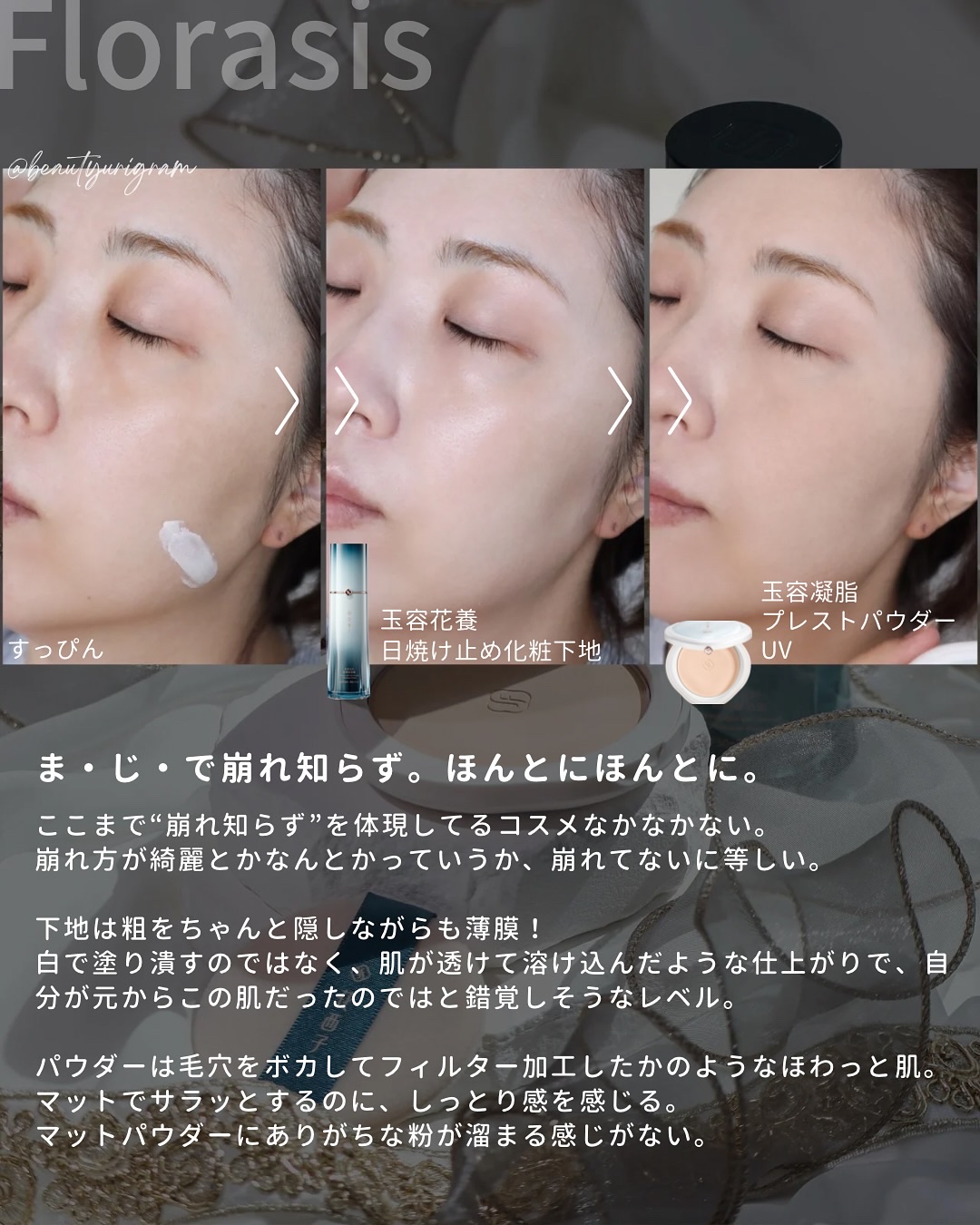 特に下地はマイベスコス候補です。【Florasis】@florasis.jp-——————————————————————■玉容花養日焼け止め化粧下地-color:01ベージュ[35g/¥5,170(税込)/全2色]■玉容凝脂プレストパウダー...