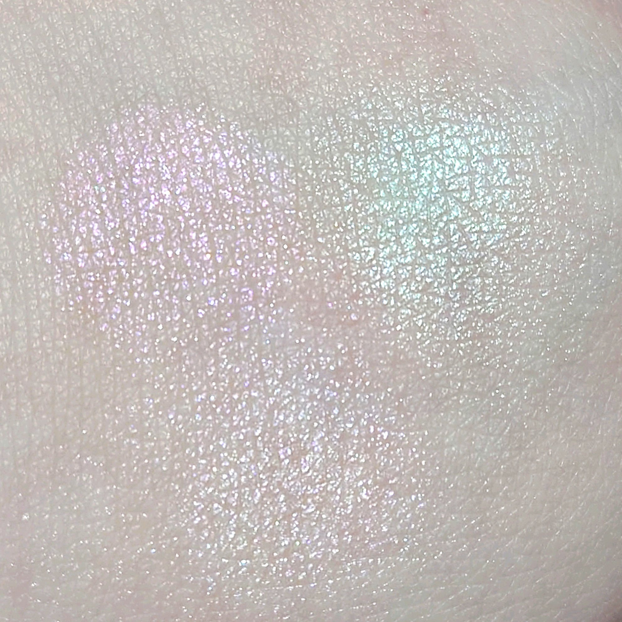 奇抜な配色に見えるこの2色は高揚カラーと鎮静カラー。 色幅のある2色で難しそうに見えるんだけど、この2色が生み出す色の相乗効果で肌を'映え'させるのよっ…! 偏光ピンクも派手に輝かずほんのり上品。 ハイライトに近いようだけど、角度で見える若干のピンクがかわいいんだよね。 熱った肌の温度をひんやりと下げるような感じ。 (メイクアップ効果の印象)