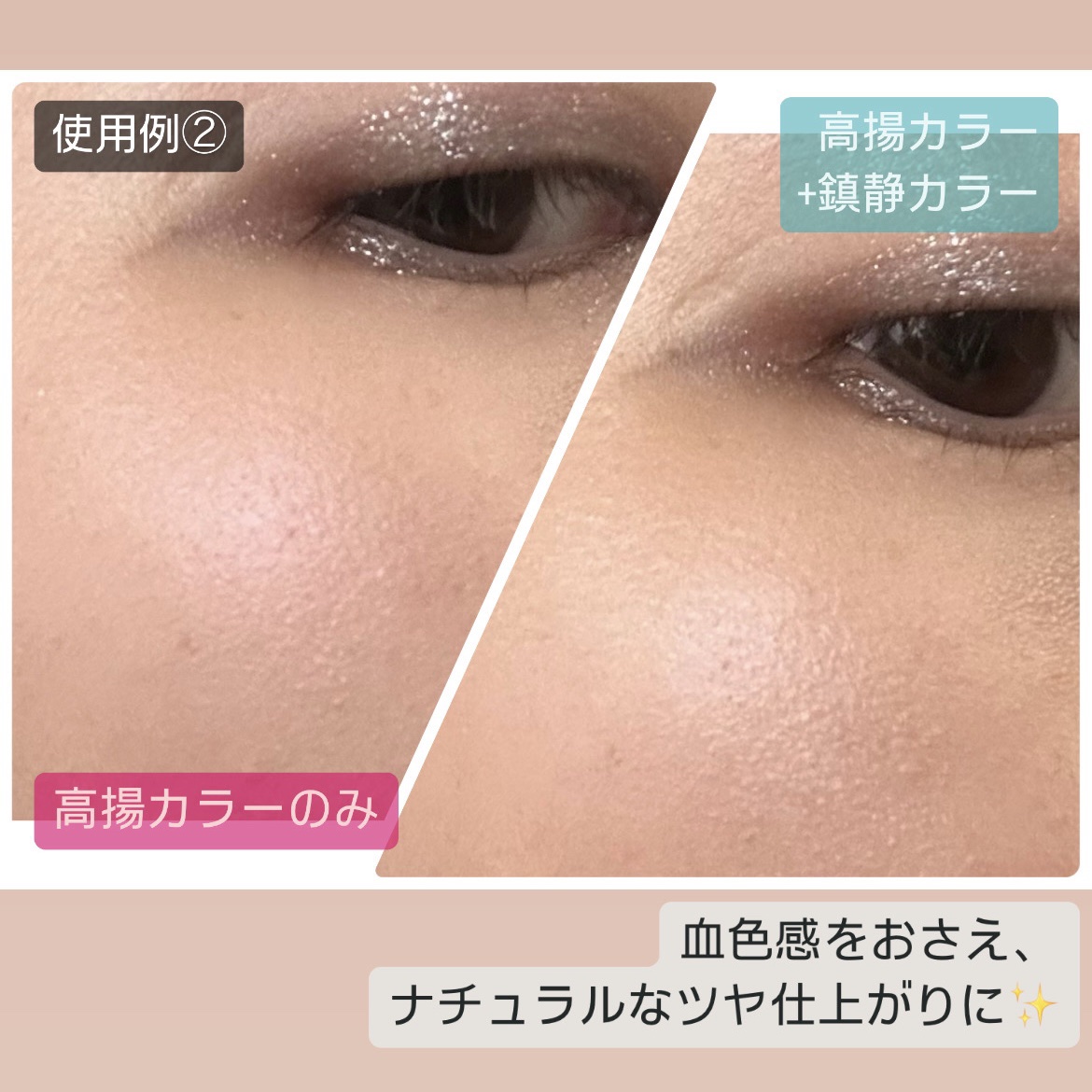 色幅のある2色で生み出す色の相乗効果で肌を'映え'させる 血色を落ち着かせるオパールグリーン 夏場特に頬の赤みが気になる私は 熱った頬こ温度をひんやりと下げるような感じ (メイクアップ効果の印象)
