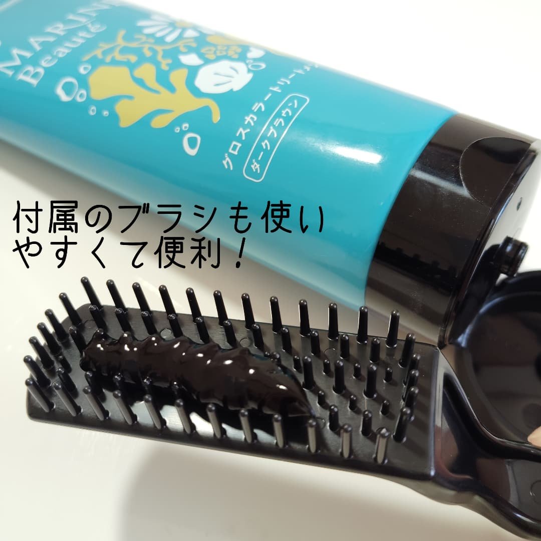 自宅で簡単白髪ケア🎃マリンボーテグロスカラートリートメント【ダークブラウン】30代を迎えてから、目立つようになってきた白髪。私はサイドは目立たないのですが、頭頂部からの白髪が増えてきました😩美容室に白髪染めに行った際、美容師さんに相談したところ、白髪は抜いたらダメ🙅♀️と言われて。それからは見つけるたびにハサミでカットしてたんですけど、少し経つと切った白髪が1〜2cmくらい伸びて結んだ時に余計目立つようになっちゃって😭そのためだけに頻繁に美容室行って白髪染めするのもお財布的にも厳しいので、自宅でできる白髪ケアは気になっていました🙌ブラシ付き&思ったより容量が多くて嬉しい☺️色は3色展開ですが、今回はダークブラウンをお試しさせていただきました!箱の内側に説明や注意事項が載ってるので開封時注意⚠️私はガサツなので少し破っちゃいました💦普段通りシャンプーしたあとに、ブラシを使って全体に塗布します。初回は3〜4日続けて使用&放置時間を通常の3分より長めにおくと効果的とのこと。(長めといっても30分以内)マリンブーケの落ち着いた爽やかな香りで髪染めっていうより普通にトリートメント塗ってる感覚。すすぎは色がでなくなるまでしっかり洗い流します!初日でもおっと思ったのですが、3日続けて使用したところ、頭頂部のピンピンした白髪が目立たなくなっている気が!!!髪色を保つためには週1〜2の使用が目安らしい。いつものトリートメントをこれに変えるだけだから簡単だしめんどくさがりの私でも定期的にケアしていけそう◎私は分からないけど職場の人からは髪色暗くした?って聞かれたので白髪が結構あったのかな〜😅お家で白髪ケア、使ってみてよかったです👌