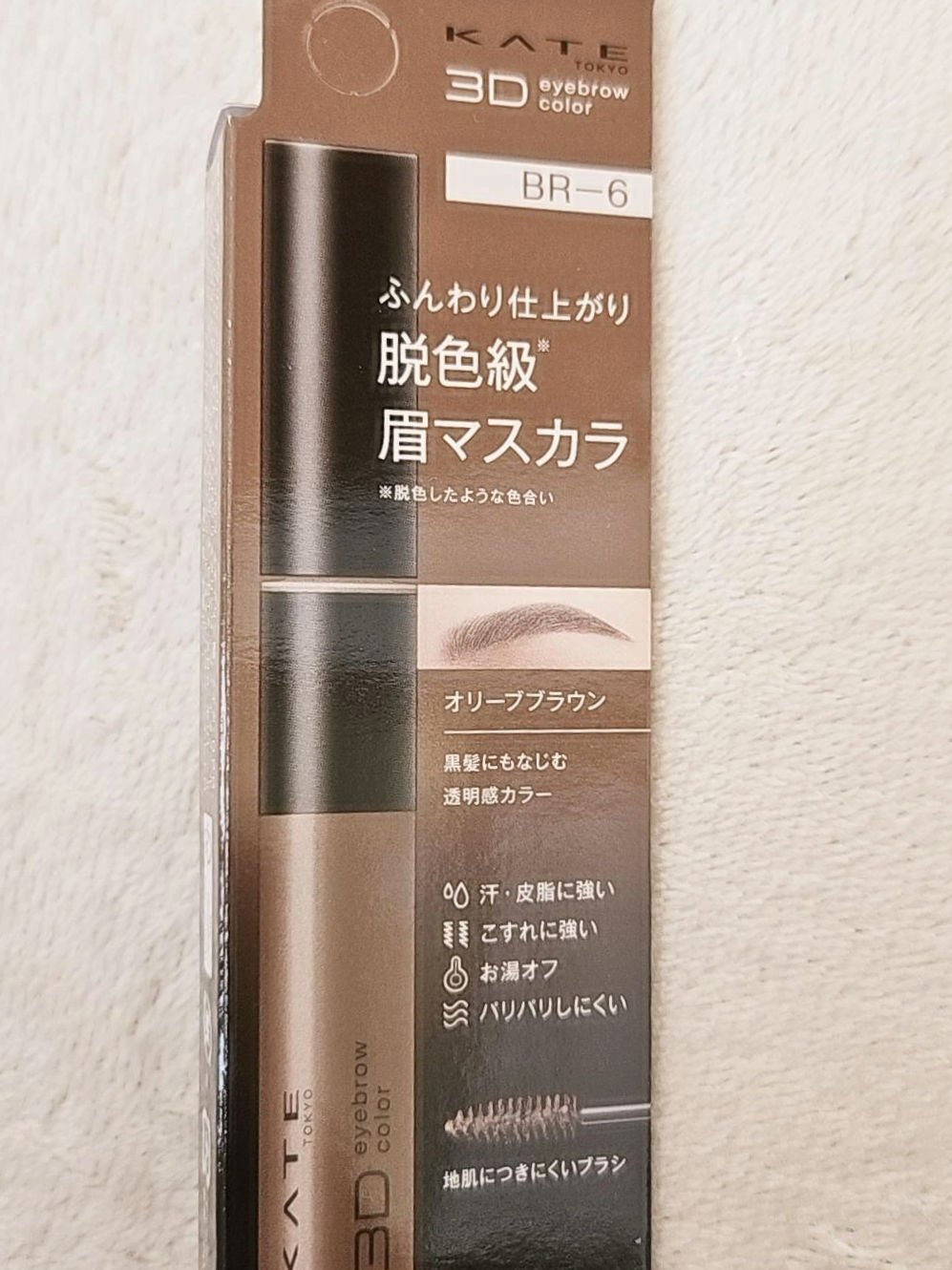 【使った商品】KATE 3DアイブロウカラーZ BR-6オリーブブラウン去年の秋に人生初の眉マスカラデビューしてから今まで眉デジャヴュの眉マスカラ(ビターブラウン)を使っていましたが、色味に惹かれて初めてケイトの眉マスカラを買ってみました!デジャヴュもとっても塗りやすくていいんだけど、もう少しくすんだ色が欲しくて…(あとケイトの方がパケが好き)もともと眉毛が少ない私は暗すぎる色の眉マスカラだと塗ってもほとんど印象が変わらないことに気づき…(斜めから見たときかろうじてわかる程度)今よりもう少しだけ明るいけどなおかつ黒髪でも浮かない色が欲しかったので、オリーブブラウンを選びました。【発色】良い【色もち】良い【良いところ】店頭でテスターを見たときはちょっと明るすぎるかなと思って一旦は買うのをやめたけど、腕に塗ってしばらくすると良い色味でUターンして購入…!!オリーブブラウンですが緑色というわけではなく、赤みがないブラウンという感じです。ちふれのグリーン系パウダーアイブロウも持っててそれに合わせようかと思ったけど、同じKATEのパウダーアイブロウBR-5にもとてもよく馴染みました。暗すぎず明るすぎずいい感じ!パリパリにも全然なりません。【イマイチなところ】デジャヴュに比べると肌にはつきやすいかも。ブラシの先端部分に液がたまりやすいのか、そこが肌に触れてしまうと地肌についてしまいました。しかし綿棒ですぐ取れるのでまあいいかな。あと奥目で眉毛部分が出っ張ってる私は、何度か確認しないと塗り残しが出てしまいました(主に下の方…)デジャヴュはズボラな自分でも急いでても一度も地肌につかなかったので、塗りやすさはデジャヴュの勝ちかもです。仕事とか写真とかきっちりしたい場面では暗い色の眉マスカラもやっぱり使いたいので、デジャヴュもまだ活躍してもらうと思います!だけど同じ3DアイブロウカラーZのダークグレージュも色味がかなり好きだったので、デジャヴュがなくなったらそれにしようかなと検討中…🤭