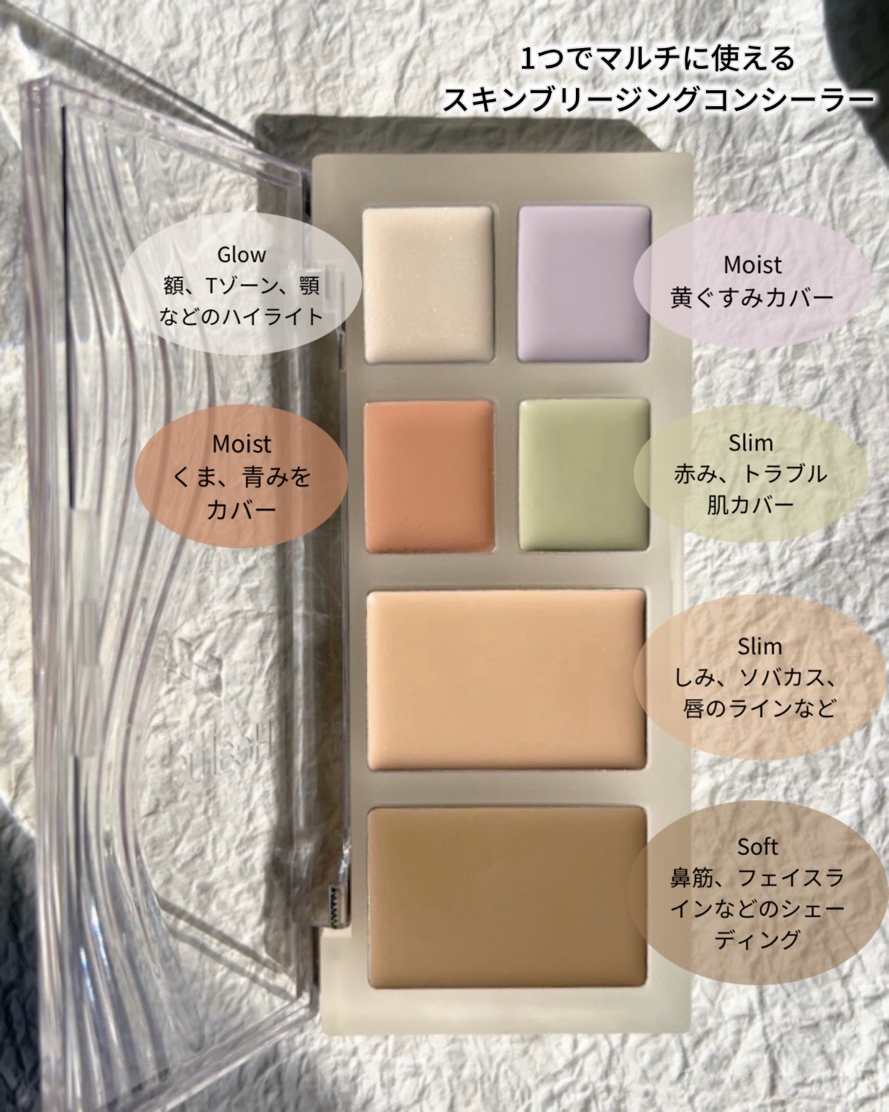 - 6色のカラーが入った、コンシーラーパレットで、コンシーラーとしてだけでなく、シェーディング、ハイライト、トーン調整が可能です。 ピーチ: クマカバーにおすすめ。保湿力が高く、ナチュラルなツヤ感です。 グリーン:ニキビや赤みのカバーにおすすめ。滑らかなテクスチャーで、カバー力が高いです。 パープル: くすみカバーにおすすめ。保湿力が高く、ナチュラルなツヤ感です。 ハイライト: 光の屈折を利用し、自然で柔らかい輝きを与えます。 シェーディング: 自然に影を演出し、しっかりと密着します。 コンシーラー: 滑らかなテクスチャーで、カバー力が高いです。