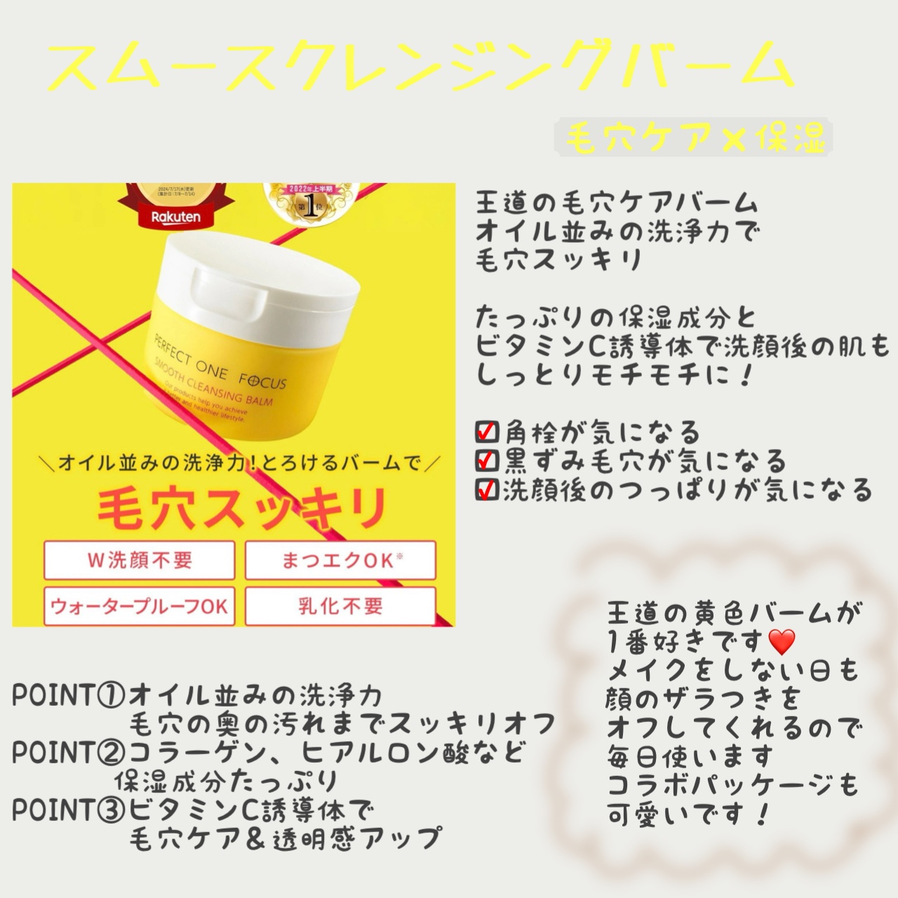 【スキンケア】リピアイテム圧倒的No.1の殿堂クレンジング/みなさん、クレンジングは何を使っていますか?オイル、バーム、クリームなど形状がさまざまでどれを使うか悩みますよね毎日使うものですから、なるべくコスパの良い商品を使いたい!!という方におすすめしたいアイテムを紹介します私が使っているスキンケア、コスメの中で1番リピート率の高いアイテムになるのでぜひ見て頂けると嬉しいです♡新作のブラックバームGL+も使ってみたのでレビューしていきます!-------------------❁❁❁------------------︎✿パーフェクトワンフォーカススムースクレンジングバーム各種シリーズ、各限定デザイン価格:¥2,970(税込)-------------------❁❁❁------------------すでにQoo10の購入品紹介などで何回も登場しているアイテムですが、詳しく魅力を伝えさせて下さい!このクレンジングの1番のポイントは『コスパの良さ!!』ですクレンジングとしての洗浄力、洗い上がり、商品の価格帯などトータル的に見て、とてもバランスの良い商品だと思います!クレンジングの形状においての違いを少し説明すると洗浄力は、強い方からオイル→バーム→ジェル→クリーム→ミルク→ローションの順になります反対に、洗浄力が強いほど肌にも負担がかかってくると思ってくださいオイルは洗浄力はしっかりあるけど肌負担も大きいミルクはメイクは落としにくいけど肌に優しいというイメージです※全ての商品が一概にそうであるとは言えませんあくまで一般的なイメージに基づいていますこれらから洗浄力と肌負担のバランスが自分に合っている形状のクレンジングを自分に選ぶ事が大切です私の場合は①肌は弱くはないので負担があっても1回で落としきる洗浄力が欲しい②乾燥してると感じるので肌がツッパるのは嫌!というポイントからバームタイプを選んでいますバームは肌にのせると体温でトロッとした質感に変化!なめらかな質感なので肌あたりよくメイクを落とせます乳化は不要なのでテクいらず!クレンジングって乳化をどれだけ上手に出来るかなので、苦手だよって人にもおすすめです洗浄力もしっかりあって上からリップ、ファンデーション、マスカラ(ウォータープルーフ)とありますがティッシュオフと比べると、しっかり落ちているのが分かります私の使用感としては、ウォータープルーフであっても、だいたいのマスカラはリムーバーが必要ないことが多いです※束感まつ毛を作るような、ねっとりした液のマスカラは落ちにくかったですバームの種類は全部て5種類○スムースクレンジングバーム[毛穴ケア×保湿]王道の黄色バームが私は1番好きです♥️メイクをしない日も顔のザラつきをオフしてくれるので、毎日使っていますコラボパッケージも可愛いです!○スムースクレンジングバームピュア[敏感肌×毛穴ケア]使用したことがないので分かりませんが季節の変わり目や、花粉シーズンなどの肌がゆらぐ時期に使ってみたいです○スムースクレンジングバームディープブラック[本気の毛穴ケア]角栓を取るのはやっぱり難しいと思いました…ブラックバームだからか、毛穴が余計に黒くなった気がしたので、リピは今のところないかな黄色バームで十分です💦○スムースクレンジングバームVC7[7種のビタミン追加!毛穴の黒ずみ集中ケア]普段の黄色バームとの使い心地は変わりませんがビタミンを少しでも肌に与えたいという思いで夏にはこのバームを使っています○スムースクレンジングバームディープブラックGL+[夏の頑固な角質ケア]6/1から新発売されるブラックバームですQoo10の先行販売で買うことができたので、一足先にレビューしてみたいと思います!定番のブラックバームが3つの進化を遂げましたPOINT①角栓・皮脂洗浄成分とマイクロクレイを新たに配合し、頑固な黒ずみ汚れを一掃!POINT②グルタチオン増量&肌荒れ防止成分をプラスして肌荒れを予防!POINT③肌に触れた瞬間とろける生メルティング処方で摩擦レスに!私の使用感として、少し残念なのが乳化するように少量の水で洗うと、黒いバームが落ちていないことが分かるくらい顔にベターっと貼りつくので、私はダブル洗顔必須でしたですが、クレンジングバームとしてはとても使いやすいアイテムですので、ぜひQoo10メガ割でお得にゲットしてください!スムースクレンジングバームシリーズが1番お得に購入できるのがQoo10メガ割なので、ぜひ使ってみてくださいね#Qoo10メガ割#殿堂スキンケア#ドラコス#スキンケア#クレンジング#クレンジングバーム#毛穴ケア