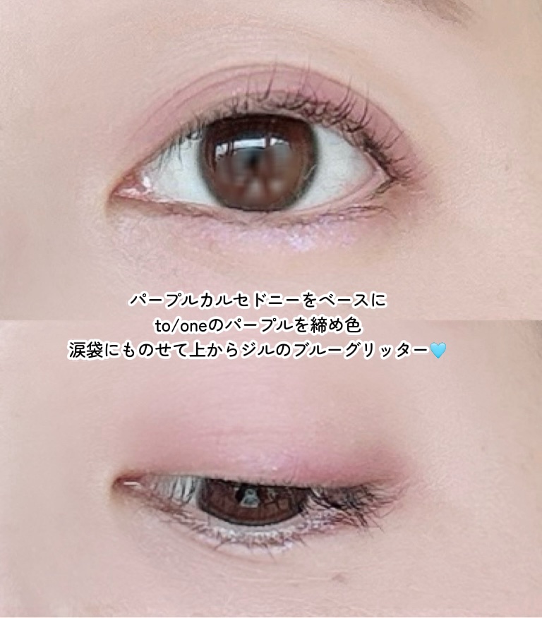 シアーパープルで儚げメイク。使用コスメは以下、 パーフェクトダイアリーのパンダのマットなベージュ2色をベースに、上瞼にラズルのPurple chalcedony、下瞼はパンダのブラウンマットを重ねて使用。 Purple chalcedonyはしっかり色付くと言うよりは、ベースの上にパープルの光が乗る感じで、儚げな印象。
