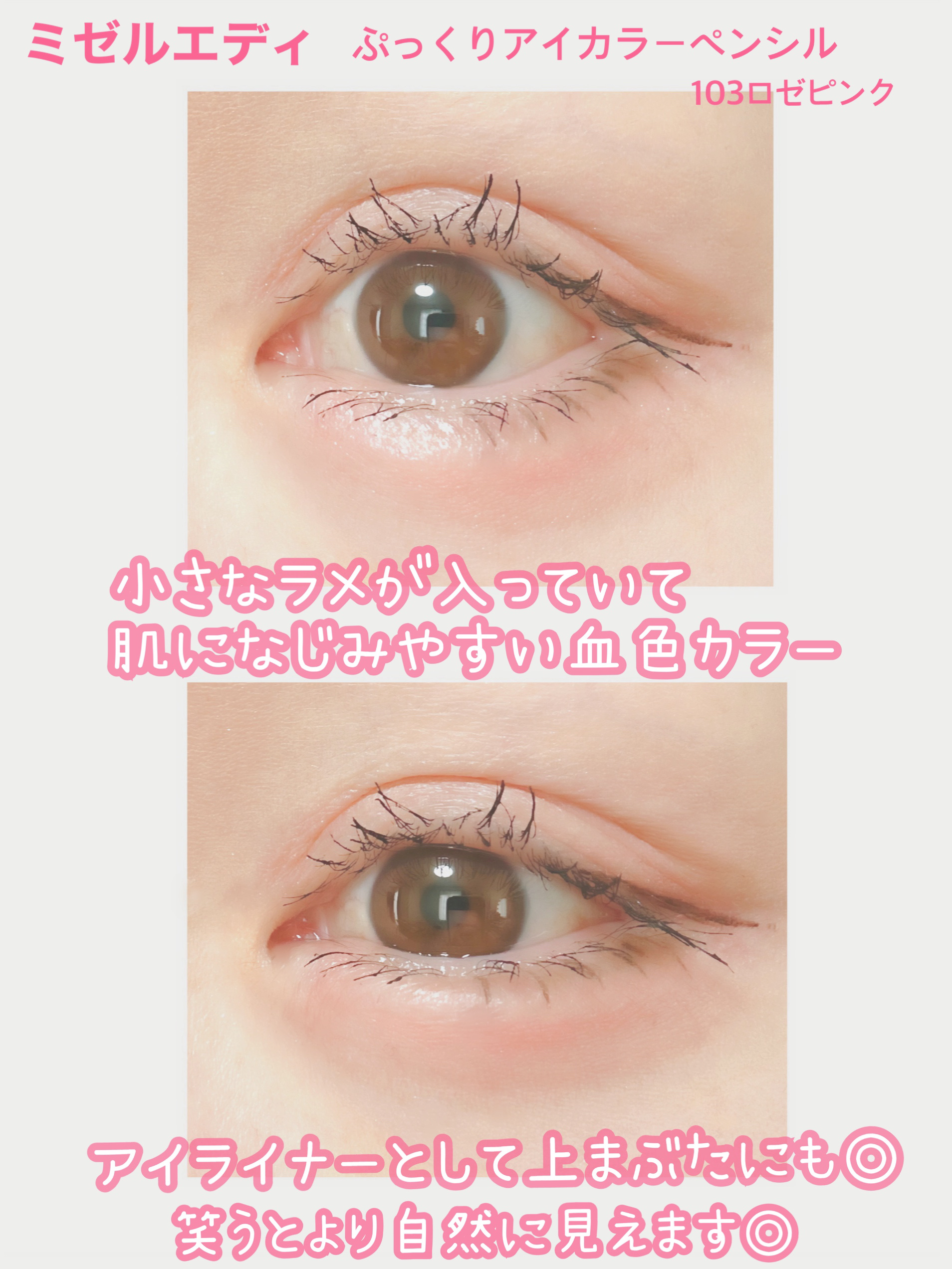 ミゼルエディのぷっくりアイカラーペンシルから限定色、103・ロゼピンクが新発売◎なめらかな描きごこちですーっと伸びてくれてギラギラもしないし肌馴染みの良い色味でした💎ピンクの色味が強いのを使うといつもはれぼったくみえてしまうのが気になって避け...